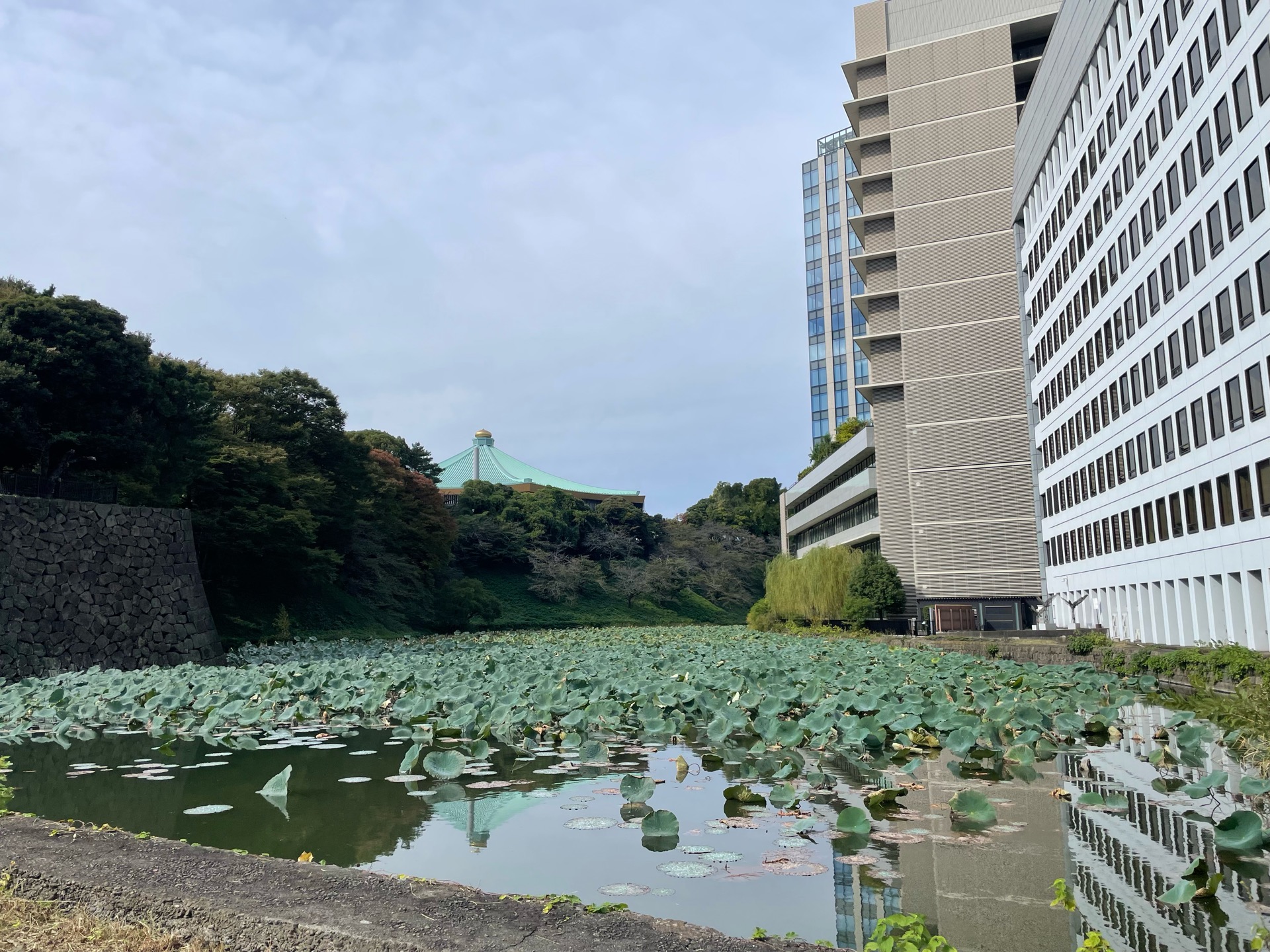 周辺には日本武道館や皇居、江戸城跡や東京国立近代美術館など文化施設が集まり、都心でありながら自然と文化の両方を感じられる立地です。奥に見えるのが武道館の屋根です。