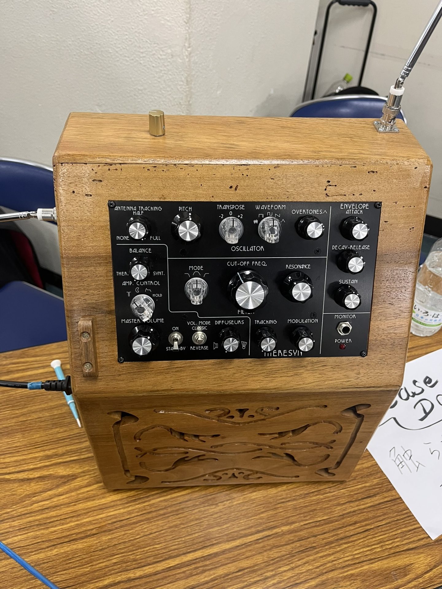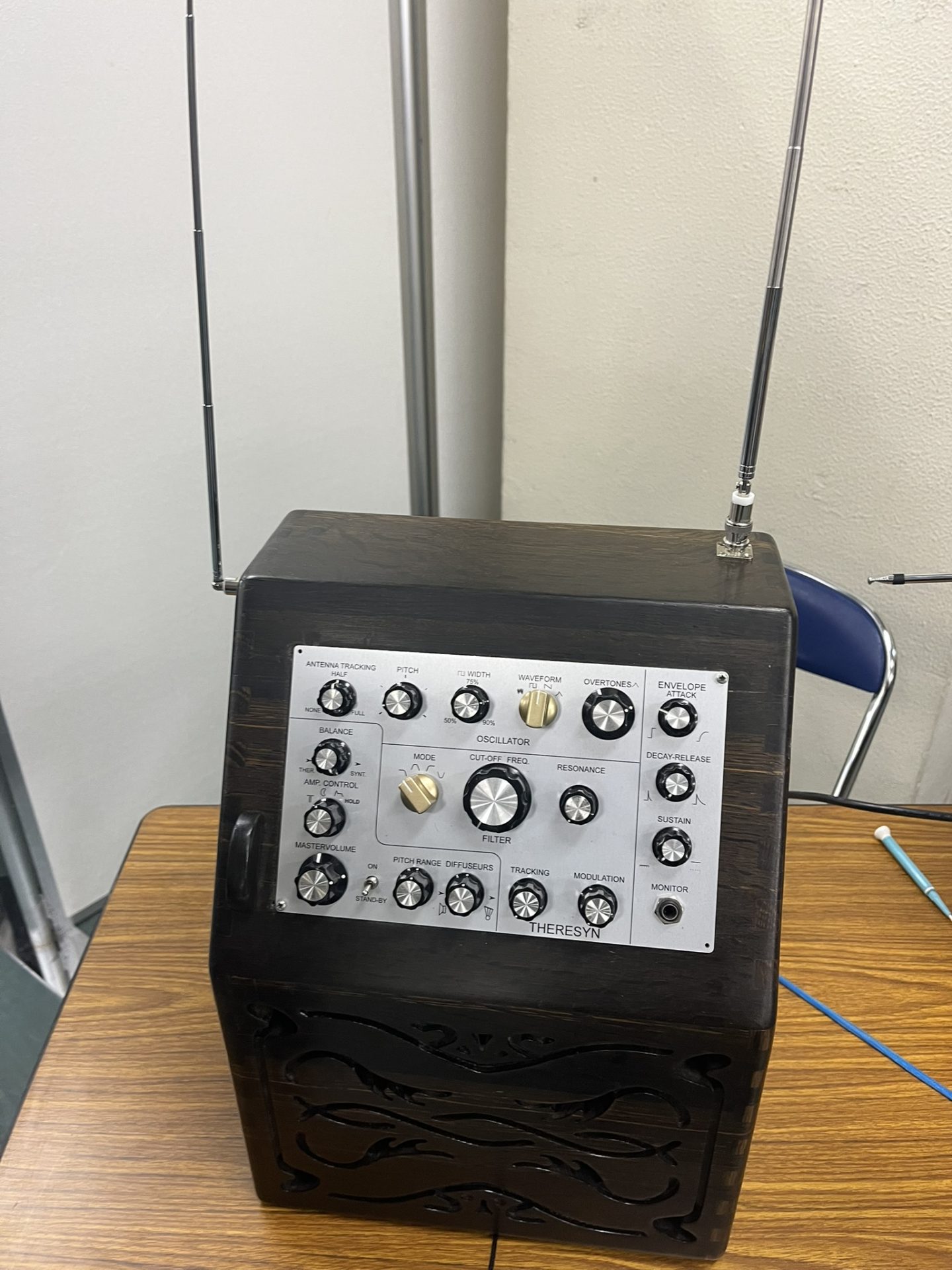 Theresynは、テルミンとシンセサイザーを組み合わせ、テルミンだけでも通常のシンセサイザーでも表現できないユニークな音楽表現を可能にする楽器です。背面には共鳴弦が備わっており、インドの古典楽器からヒントを得た特殊なブリッジが、共鳴音に豊かな倍音を加えます。