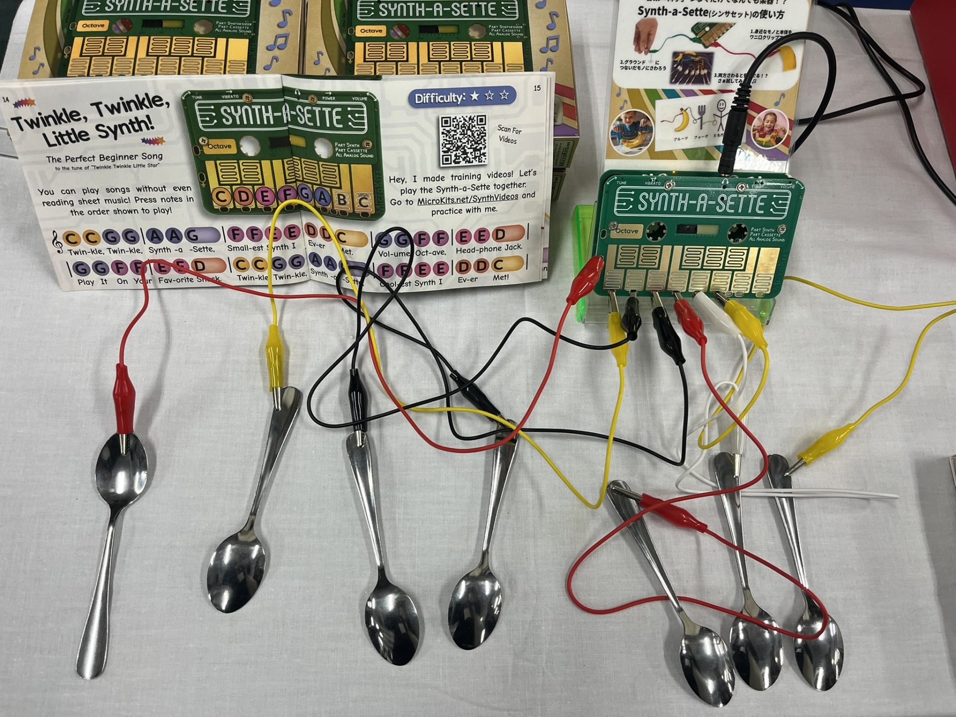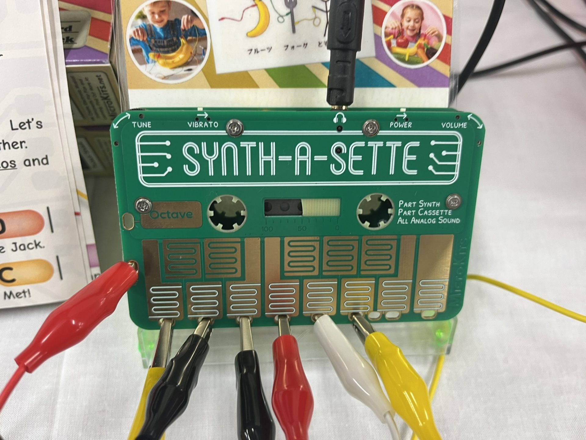 レトロカセット風デザインの小型シンセサイザーSynth-a-Setteは、導電性素材を利用して音を発する仕組みを採用。文房具や果物といった身近なものを“鍵盤”として使えるため、遊びながら電気の伝導を学べる音楽ツール。