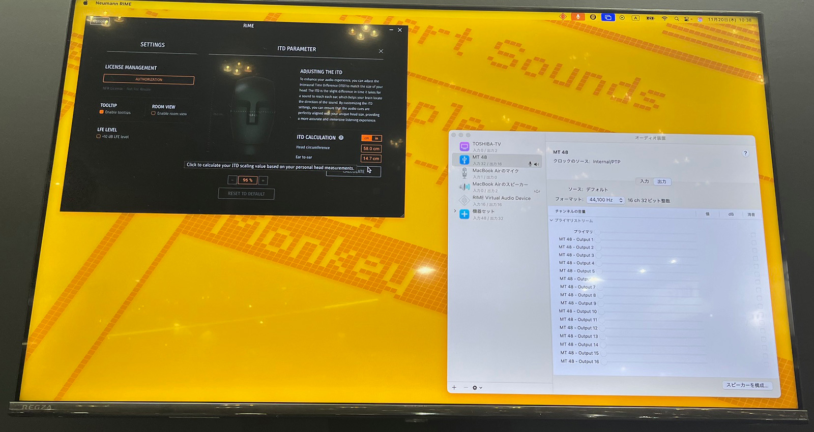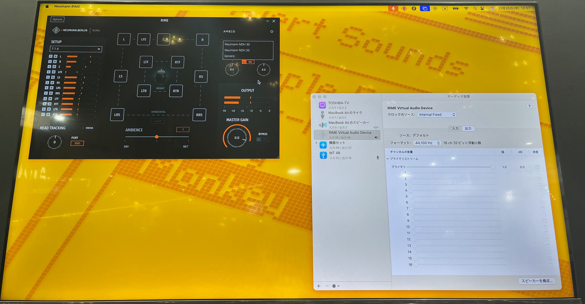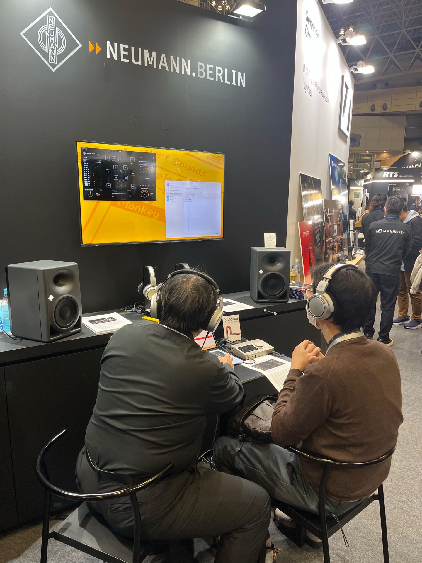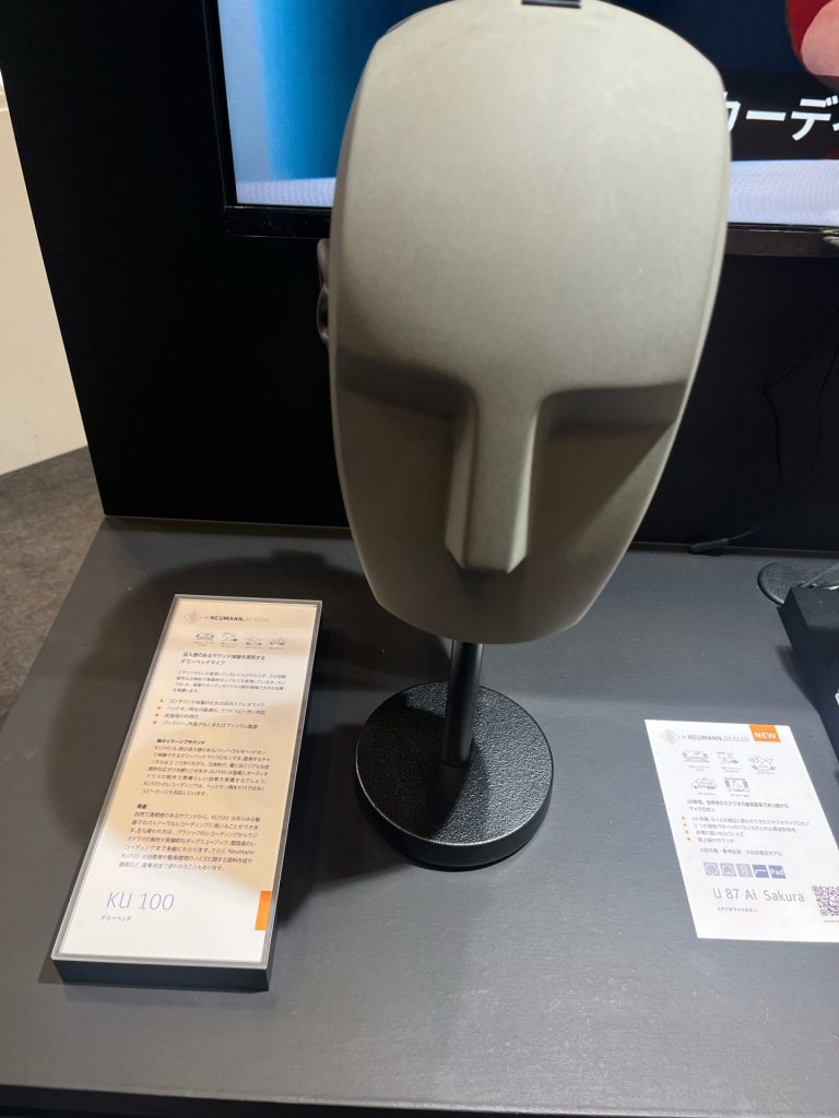 ブースでは、Apple Musicの空間オーディオの音源を「RIME」側で受け取り、「MT 48」で再生する形式でした。どうしてイマーシブサウンドを再現できるのかというと、頭部伝達関数(HRTF)および両耳室インパルス応答(BRIR)の独自の計算を適用することで、音波が頭部や耳で変化する様と、部屋の残響特性を正確にシミュレートできるとのこと。これはダミーヘッドマイク「KU100」のノウハウから発生したようです。
