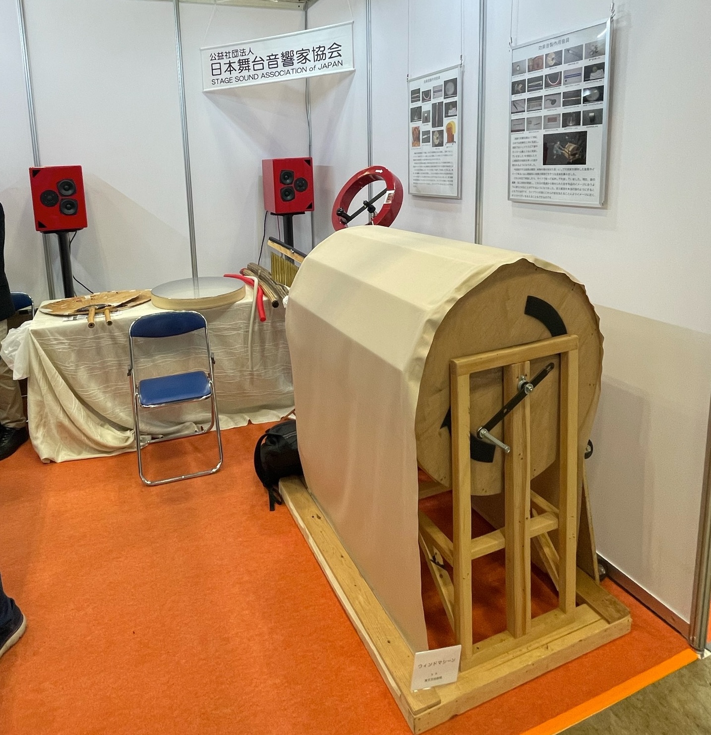 日本舞台音響家協会さんも出展、様々な効果音装置を展示中。右はハンドルを回すと風の音が生まれるウインドマシーンです。