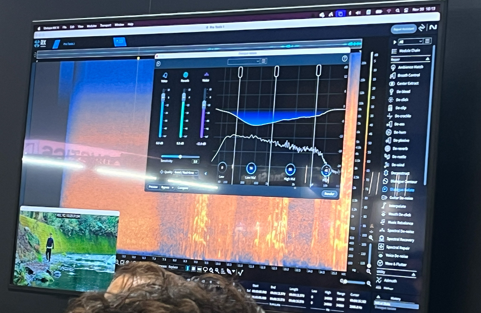 実際にドラマで使用された映像・音声データを題材に、セリフと環境音をどのように分離・軽減するかを解説されました。川のせせらぎなど不規則なノイズを自然に処理するには高度な編集が必要ですが、RXを使えばセリフに違和感を残さずにノイズを大幅に抑えられることを実演。