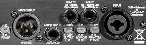 他にもファンタム電源やローカット、インサート端子などを装備。REMOTEという端子はライブでは欠かせない切り替えのフットスイッチを挿すことができます。