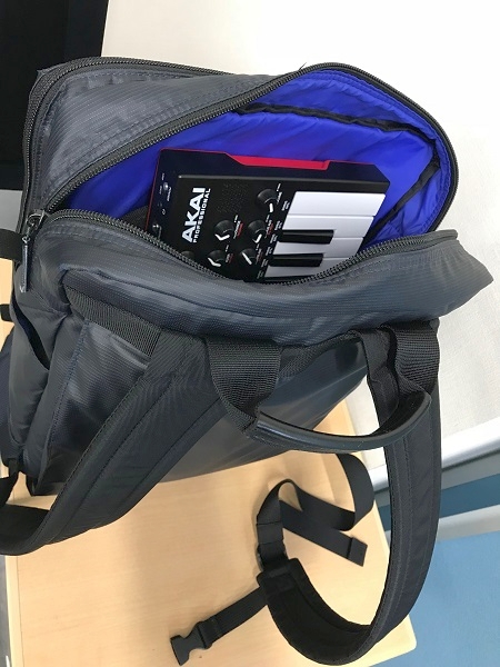 MPK Mini Playは内蔵音源搭載、スピーカーとヘッドフォン端子を装備、しかも単3電池3本で駆動するベロシティ対応25鍵MIDIキーボード/パッドコントローラーです。内蔵スピーカーは音をチェックするのに十分な音量。ちょっとした耳コピや譜面書きの際のチェックなどにも重宝します。ありそうでなかったMIDIキーボードですね。