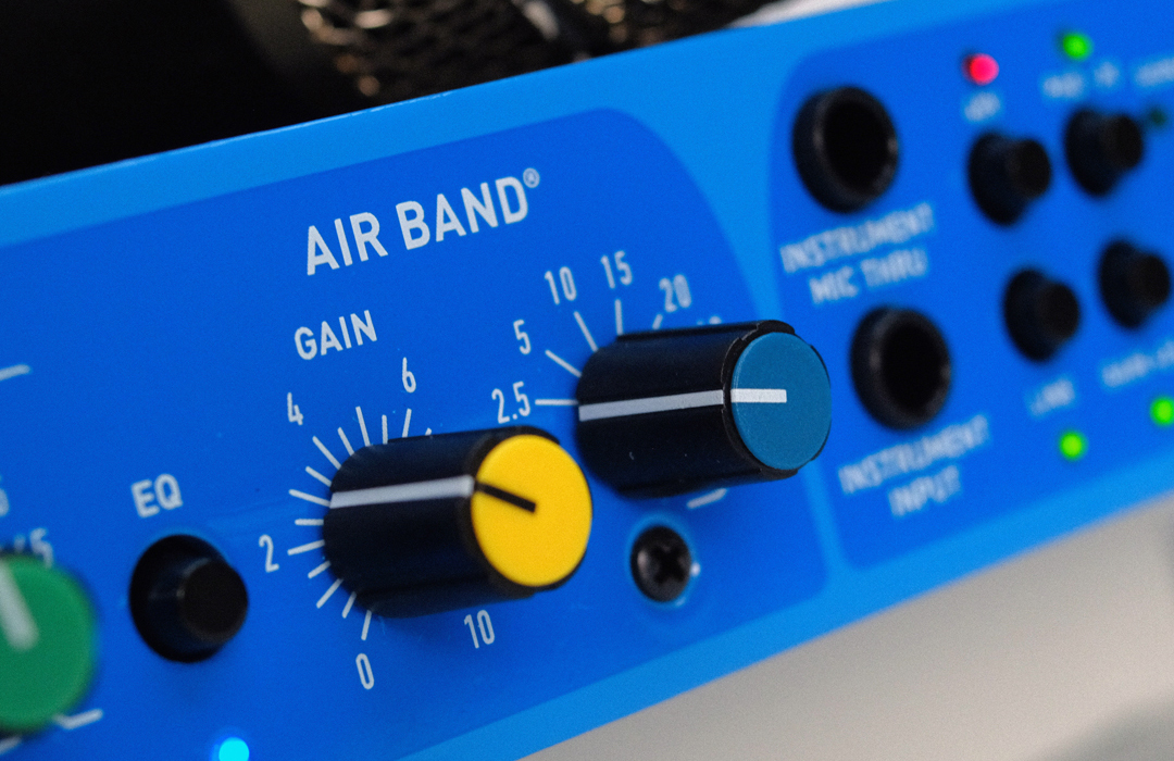 イコライザーの 3 番目のバンドは、2.5、5、10、15、20、および 40 KHZ の周波数を選択できる AIR BAND シェルビング セクションで、独自のコントロールと最大 9 dB のブーストを備えています。AirBand イコライザーと低周波イコライザーはバイパスプッシュボタンを共有しています。