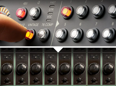 レイ・チャールズやヴァン・ヘイレンなどの数々のレコードで聴かれる伝説的なUA 610真空管マイクプリアンプのサウンドを再現する、真空管エミュレーション回路による「ビンテージモード」を搭載しており、接続するマイクや楽器に温かみと存在感のあるアナログトーンをもたらします。これに加え、UAの名機1176に着想を得た8基の「76コンプレッサー」も内蔵し、ボーカルや楽器にパンチを与えることができます。