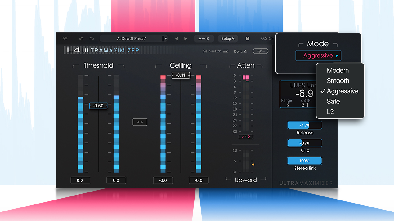 L4 Ultramaximizerには、Modern、Aggressive、Smooth、Safe、そして伝説的L2を継承した5種類のモードを搭載。ジャンルや楽曲の方向性に合わせて選択でき、繊細なアコースティック作品からEDMのパワフルなトラックまで幅広い対応が可能です。これにより、従来の「音を潰す」だけのリミッターではなく「音楽を活かす」仕上がりを実現できます。特にAggressiveモードはインパクト重視、Smoothモードはナチュラル感を必要とする場面に最適です。