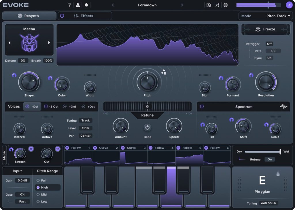 Evokeの核となるのが、リアルタイムで声を再生成する独自アルゴリズムです。録音済みのボーカル素材を解析し、音素ごとの質感・倍音・リズム要素を再設計。これにより、従来のピッチ補正プラグインやボコーダーでは到達できなかった表現の深度と自然さを両立します。ボーカル本来の表情を保ちながら、機械的にも有機的にも響く新しい“声”を生み出すことが可能です。