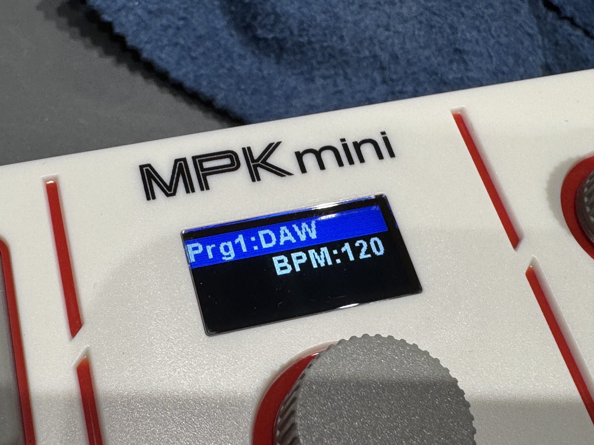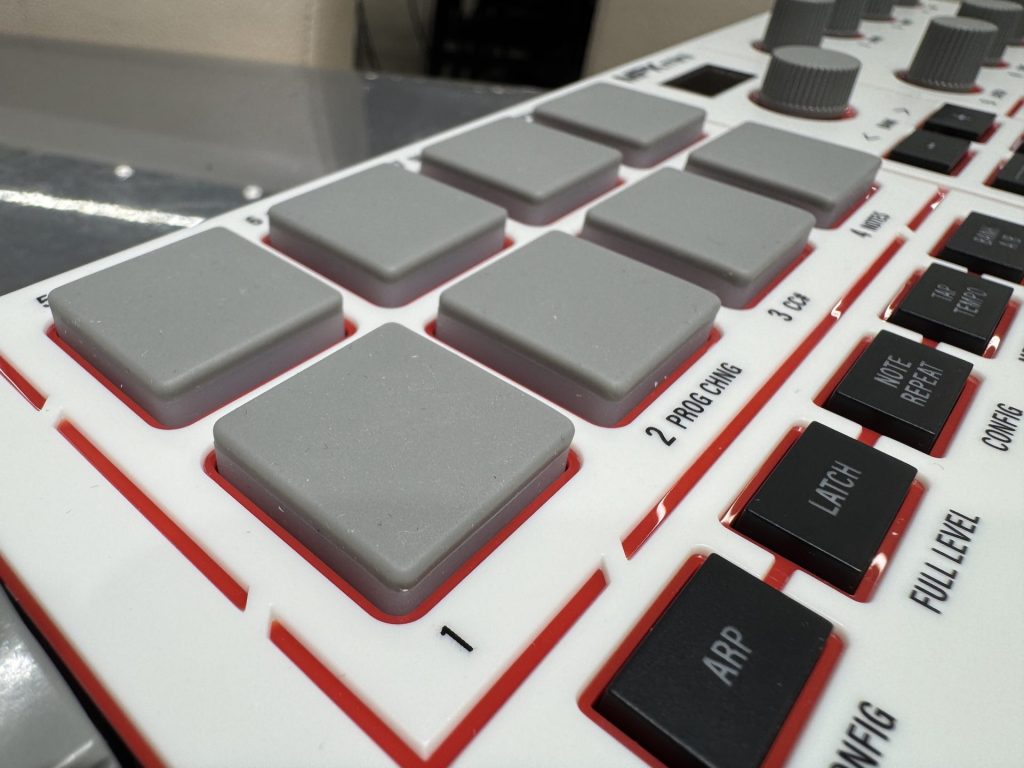 ノブも指先が滑りにくく、回しやすい形状になっており、また全体的なボタン配置も旧モデルのMPK mini MK3では上下左右に配置されていたのが、今回のMPK mini Ⅳからは横一列に統一されており、操作性が向上していると感じました。