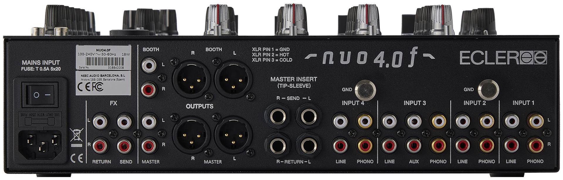 NUO4.0Fの内部アーキテクチャは、ECLER伝統のミキサー群を手掛けた名エンジニア、ドミンゴ・メレが設計しました。筐体はバルセロナで製造され、クラシックなブラックとシルバーの2モデルをラインアップ。堅牢なメタルシャーシにより高い耐久性を誇りながらも、操作性と配置バランスに優れたレイアウトを実現しています。