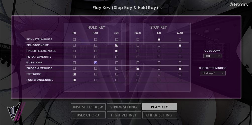 さらに「プリ・ノイズ」機能により、ノートのアタック部分に微細なノイズを付加することで、ピッキングの雰囲気を変える用途に利用できます。ノイズは複数種類から選択でき、フレーズやジャンルに合わせてキャラクターを使い分けられます。