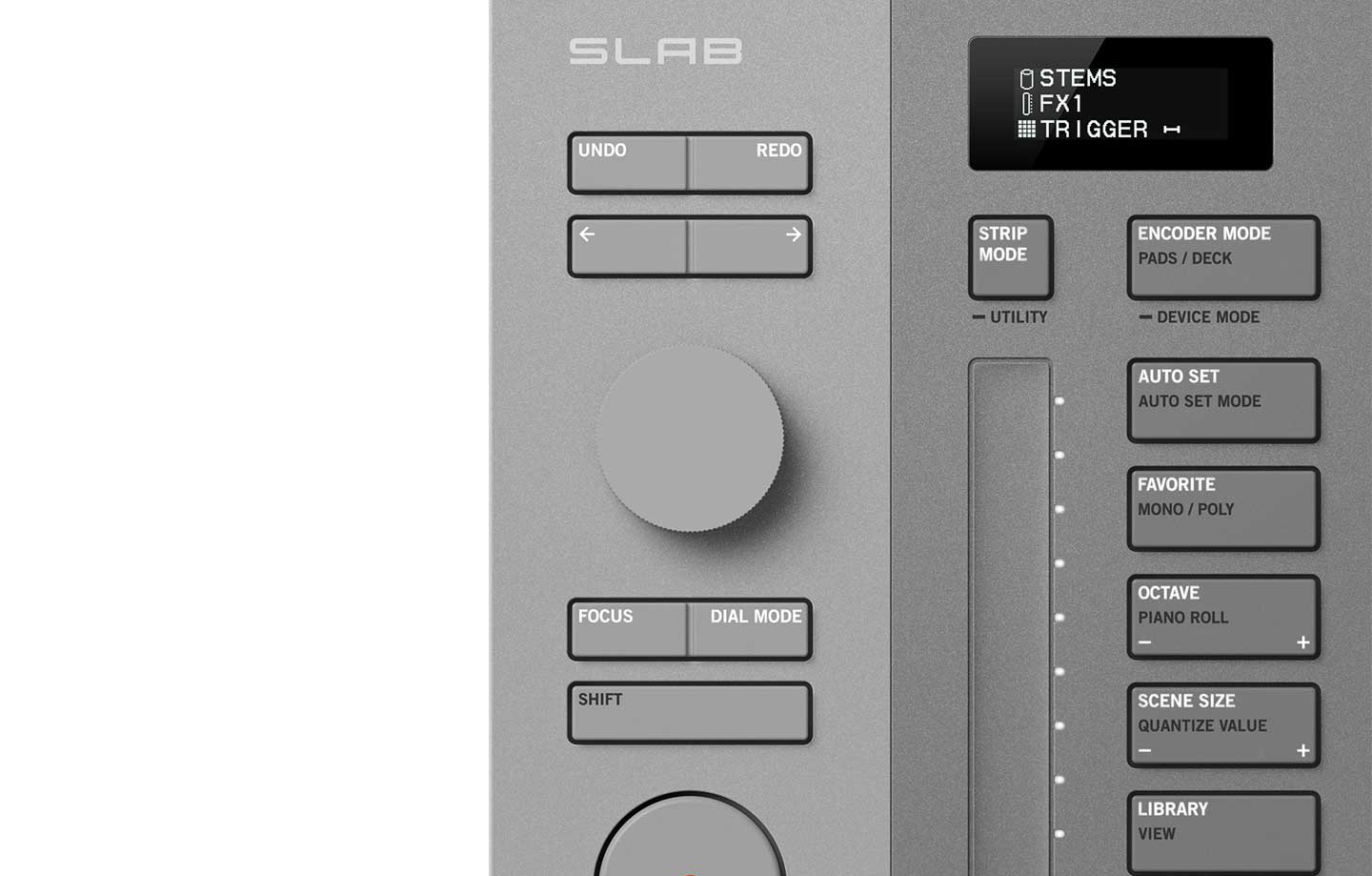 SLABの多機能ダイヤルには「Focus Control」機能が搭載されており、マウスポインタを合わせたパラメーターをそのままハードウェア側から操作できます。事前の複雑なMIDIマッピングは不要で、ソフト音源やサードパーティー製エフェクトのノブを画面上で選ぶだけで、その時点で“フォーカス”しているパラメーターがSLABの操作対象となります。これにより、画面上の細かなパラメーター調整も、ハードウェアのノブを回す感覚でコントロールでき、マウス操作中心の制作に比べて圧倒的にスピーディーで音楽的なワークフローが実現します。上部のOLEDディスプレイはパラメーター名や値、ソフトとの連携状態を視認しやすく表示し、暗いスタジオ環境でも視認性を確保。4つのタッチセンス対応エンコーダーに触れるだけでアサイン状況を確認できるため、EQ/STEMS/エフェクト/各種パラメーターの切り替えも迷わず行えます。
