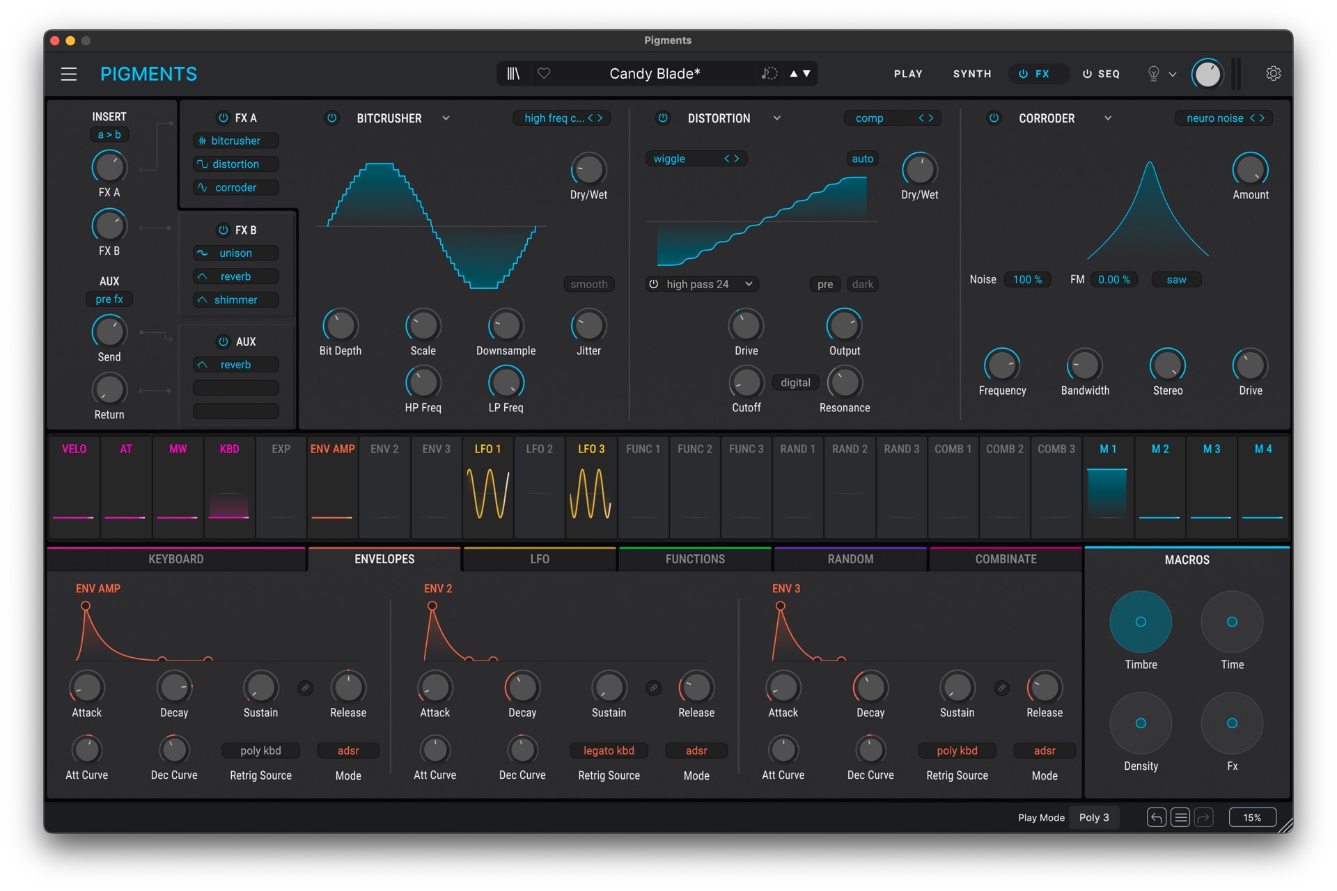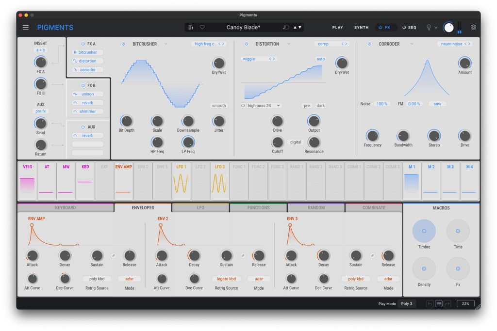 Pigmentsは3つのエンジンスロットに6種類の音源方式を割り当て可能な、柔軟性の高いマルチエンジン構成を採用しています。モーダルやグラニュラーによる実験的サウンドから、ウェーブテーブルやバーチャルアナログによる定番の音作りまでを網羅。さらにユーティリティエンジンや外部オーディオ処理にも対応し、ジャンルを超えたサウンドデザインを支えます。