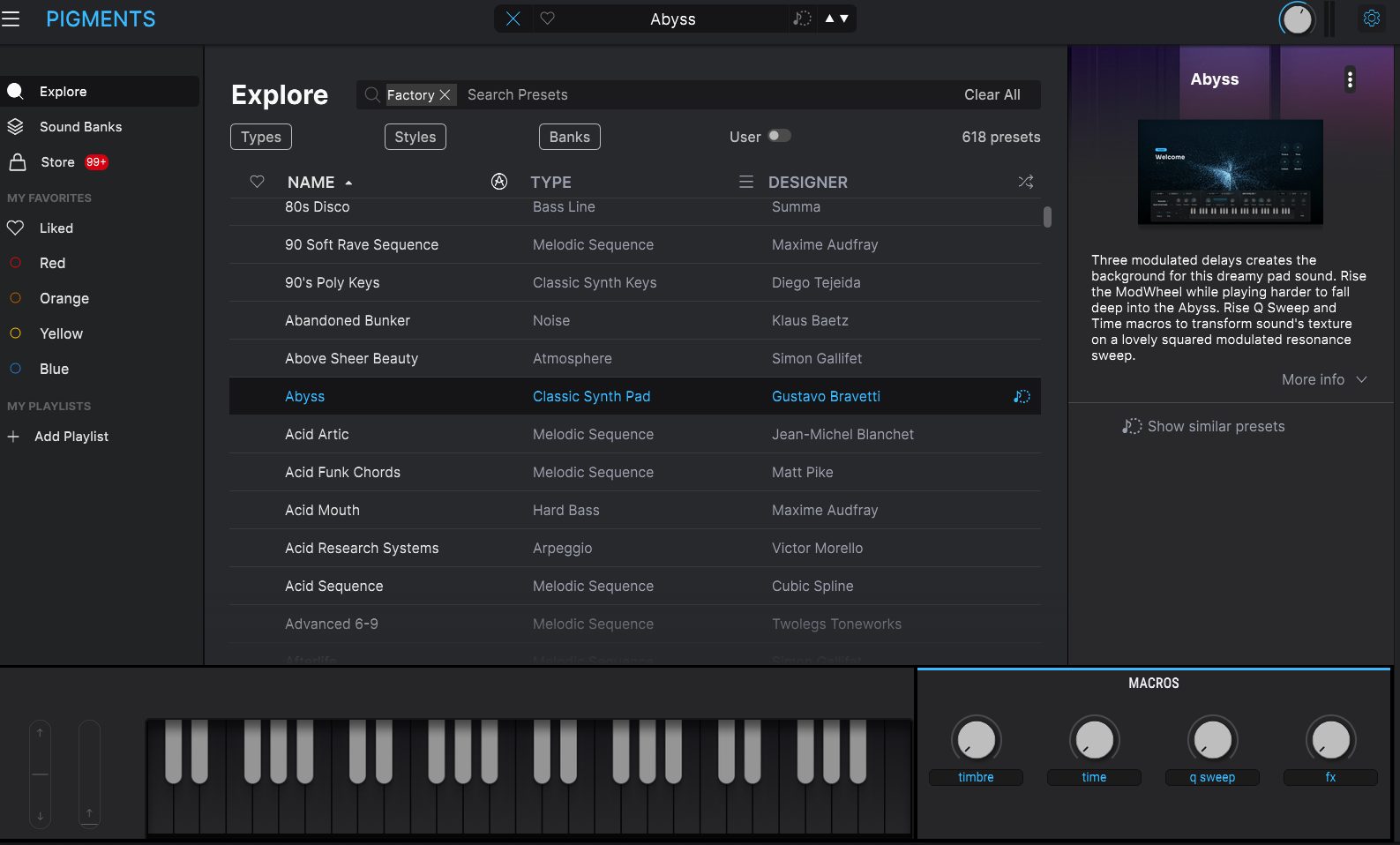 1,700種類以上のファクトリープリセットを収録し、ベース、リード、パッド、シーケンスなど幅広い用途に対応。さらにExplorationsシリーズをはじめとする拡張音源により、アンビエント・トラップ、ダブステップ、IDMなど、現代的なエレクトロニックジャンルに即したサウンドを継続的に追加できます。