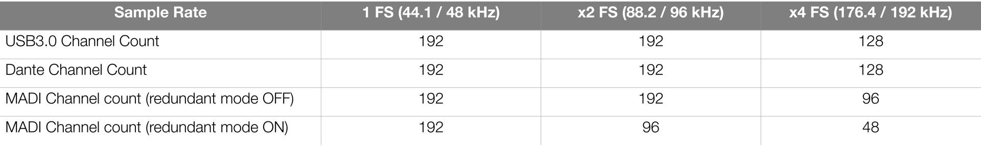 - 48/44.1 kHzで192チャンネル、96/88.2 kHzで192チャンネル、192/176.4 kHzで128チャンネル