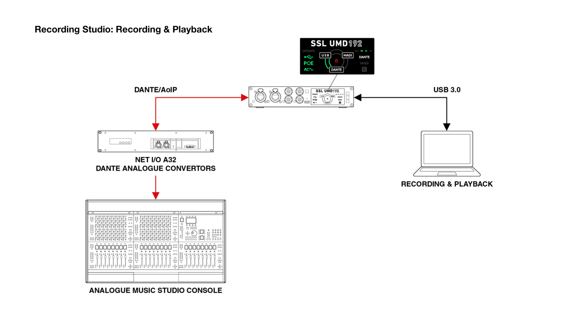 UMD192は接続するシステムに応じて柔軟に役割を変化させます。SSLのコンソールであるSystem TやORIGINとの組み合わせでは、コンソールに不足しがちなフォーマット変換機能を補完する役割を果たします。一方、DAWベースのスタジオや、Harrison 32ClassicのようなDante対応システムにおいては、高品位な96kHz/192kHz対応のUSBインターフェースとして機能します。また、PCを使用しないスタンドアロン運用も視野に入れた設計となっており、フロントパネルの物理ボタンで信号フローやクロックソース、リダンダント設定を直感的に切り替え可能です。誤操作を防ぐロックアウト機能も搭載しており、どのようなシステムに組み込んでもエンジニアの意図通りに確実に動作するよう設計されています。