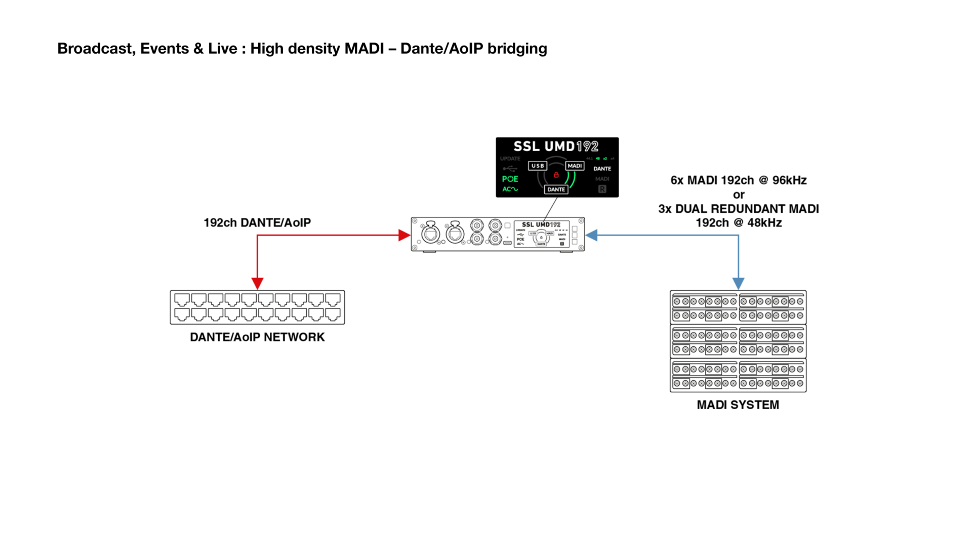 - MADI、Dante、USBの異なるフォーマット間で最大192chの双方向オーディオ変換・入出力を実現