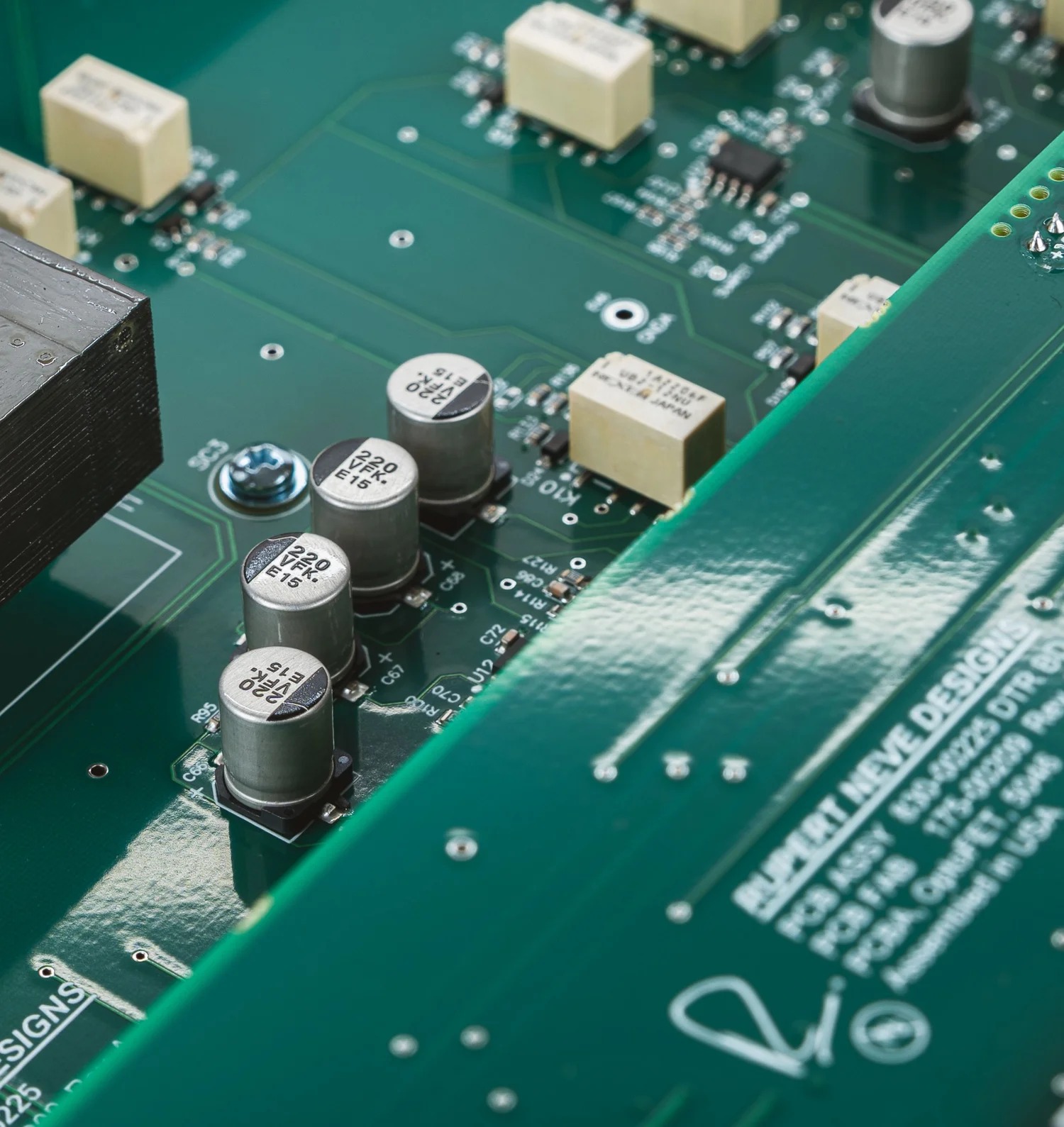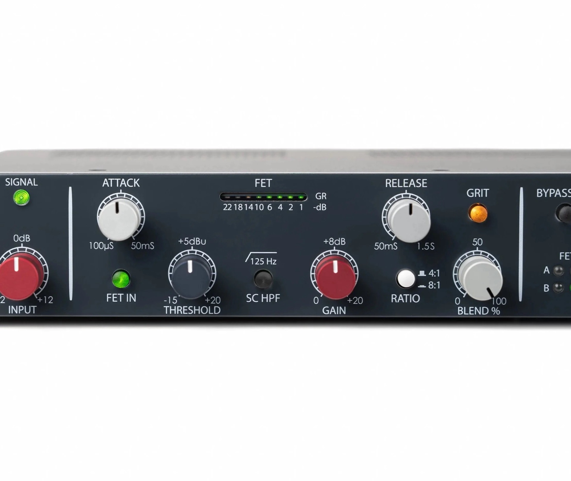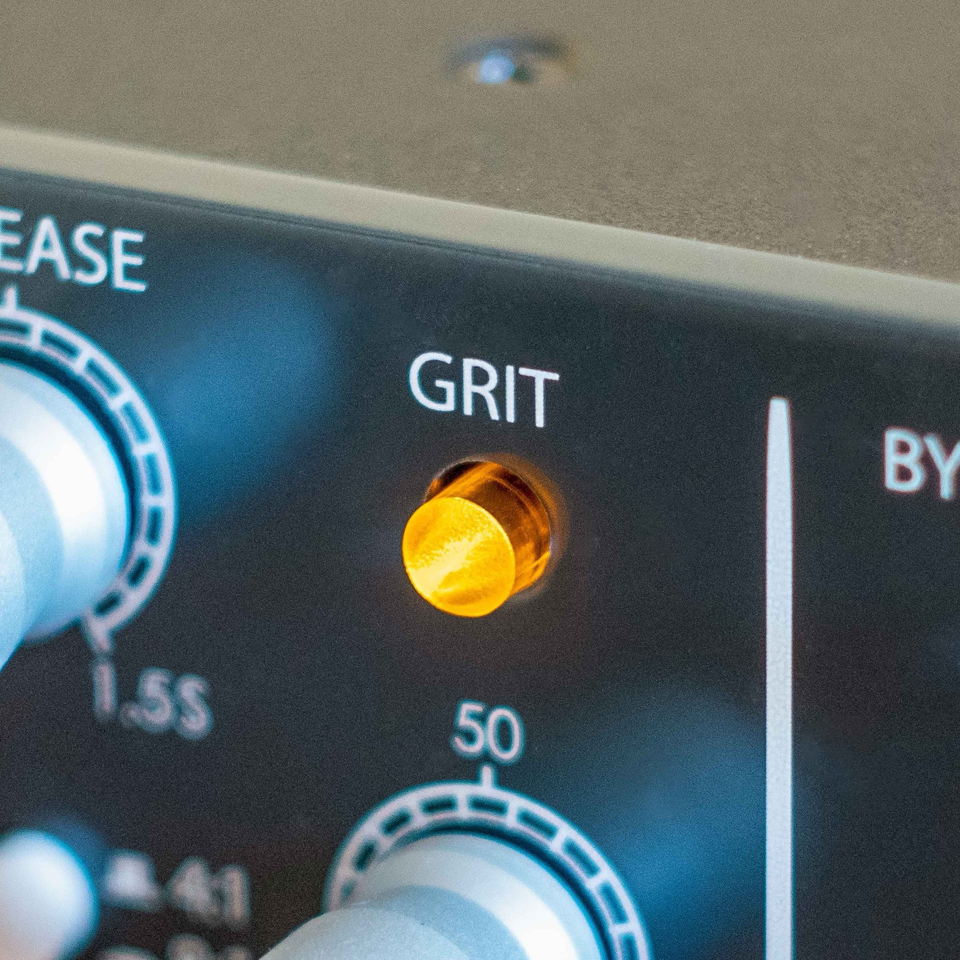 本機に搭載されたFETコンプレッサーは、Rupert Neve Designsのエンジニアリングチームが長年実験を重ねて完成させた全く新しいデザインです。最速100マイクロ秒(0.1ms)という超高速アタックタイムや、4:1または8:1のレシオ設定など、FETならではの特性を備えつつ、現代的な精度も兼ね備えています。さらに特筆すべきは「GRIT」モードの搭載です。このスイッチを入れると、FETコンプレッサーは強力なウェーブシェイパーへと変貌し、高域成分を中心に豊かな倍音歪みを加えることができます。これにより、ソースをオケ中で際立たせたり、攻撃的なキャラクターを与えたりすることが可能です。Blendノブと併用することで、原音の芯を残したまま適度なダーティさを加えるといった高度な処理も容易に行えます。