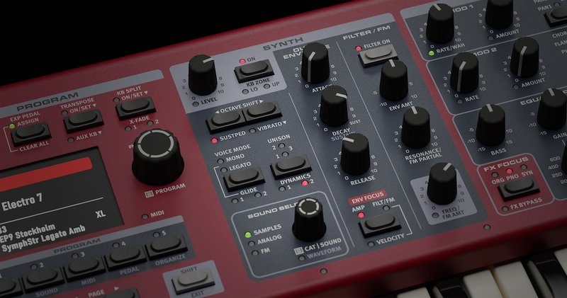 また、Nord Sample Library対応サンプルを扱える従来の方式に加えてアナログ波形とFM方式を新シンセ・セクションを搭載。専用エフェクトをセクションごとに備え、カラー表示の新パネルと相まって、ライブのセッティングから表現の追い込みまでを素早く完結させることができます。