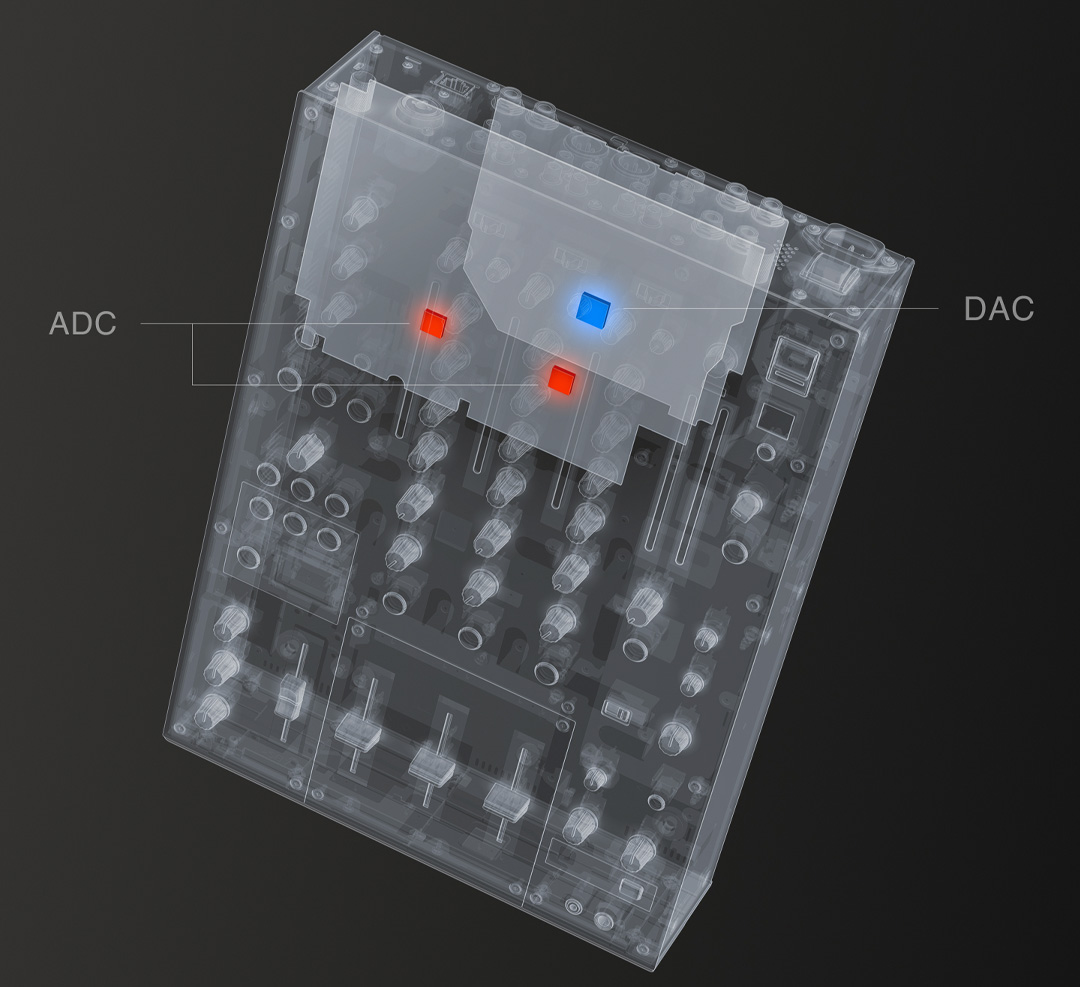 サウンド面は「高解像度かつウォーム」というDJM-V10の方向性を継承。複数の音源を重ねても飽和感を覚えにくい、バランスの取れたミキシングを目指しています。心臓部にはスタジオクオリティの96kHz/64bitミキシングDSP処理を採用し、チャンネル入力部とMASTER出力部にはESS Technology社製の32bit高音質A/D、D/Aコンバーターを搭載。さらに音質パーツの選定と最適化を行い、クラブ等の実使用環境で試聴テストを重ねることで、輪郭・空間表現・音と音の余白の見通しまで丁寧に磨き上げられています。