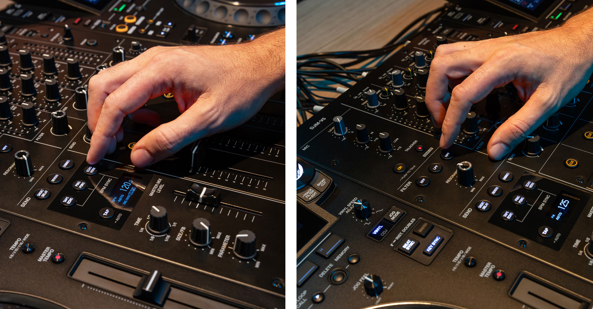 DJM-V5はワイヤレス、リンク、デバイス連携をまとめて強化されています。当社ミキサーとして初めてSonicLinkを内蔵し、操作と音のズレを感じさせにくい超低遅延ワイヤレスモニタリングを実現。HDJ-F10とはボタン一つでペアリングでき、今年発売予定の新型ヘッドホンでは本体前面のヘッドホンタッチエリアに触れるだけでペアリングが完了します(HDJ-F10はタッチエリアでのペアリング非対応)。