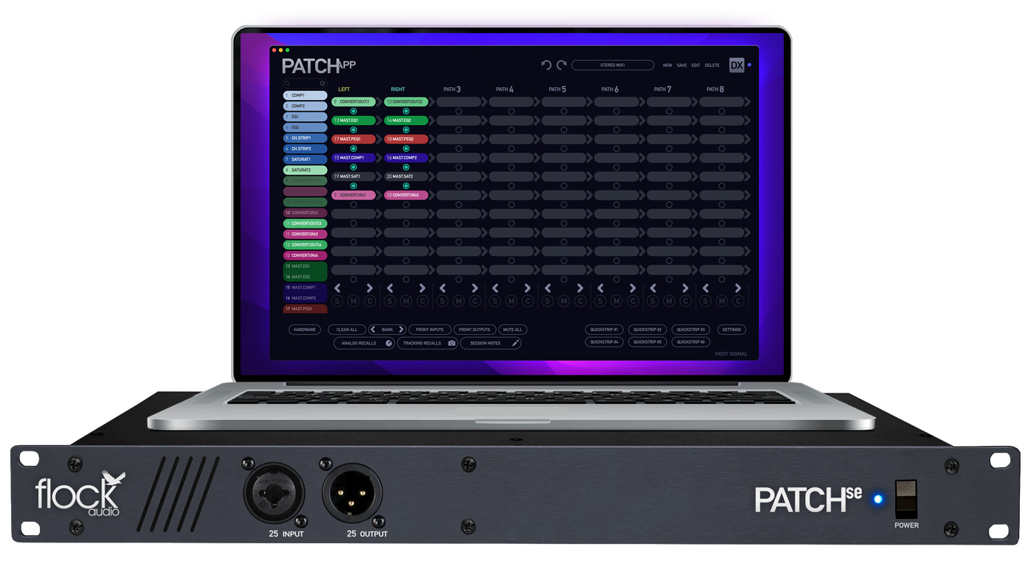 「PATCH se」は、Flock Audioのマルチ特許マトリクス技術による「デジタル制御のアナログ・ルーティング」を採用し、ルーティング作業そのものをPATCH APP(またはPATCH APP [DX])へ集約します。入出力を画面上で結び替え、構成を保存し、必要な瞬間に呼び出すという流れを構築できるため、レコーディングとミックスで接続を切り替える場面でも、物理配線の作業量を抑えたワークフローに移行できます。