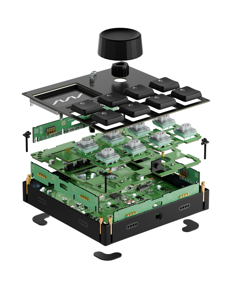 Gridは、利便性とポータビリティを追求して設計されています。複数のモジュールを接続する場合でも、好きなモジュール1台にUSB-Cケーブルを挿すだけで、接続されたすべてのGridコントローラー(最大8台までハブ不要で運用可能)に電源とデータを供給できます。これにより、デスク上のケーブルのごちゃつきから解放され、スマートな制作環境を構築できます。