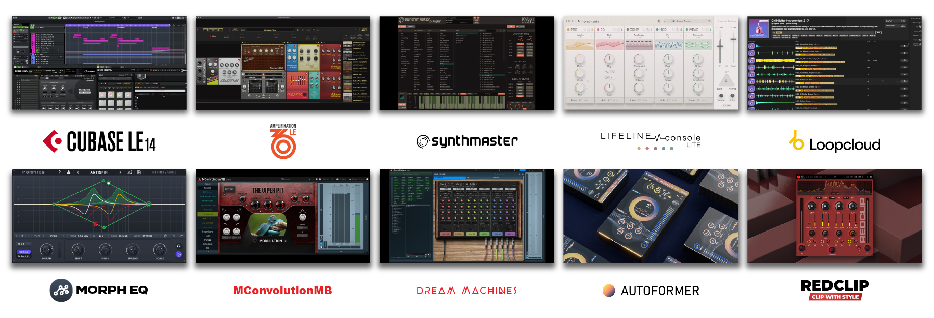 DAWソフトSteinberg Cubase LEを中心に、作曲で活用できるバーチャルインストゥルメント、レコーディングに便利なギターアンププラグイン、その他ミックスなど活躍するEQやリバーブ、マルチ・エフェクトなどのプラグインバンドル「Carver Creative Pack」が揃います。