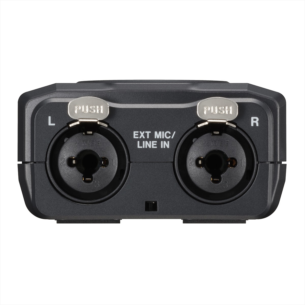 また、底面には+48Vファンタム電源に対応したXLR/TRSコンボジャックを2系統装備しています。お気に入りのコンデンサーマイクを接続したこだわりの収録はもちろん、最大+24 dBuまでのステレオライン入力にも対応しており、外部のPAミキサーなどからの音声出力を直接高品位にステレオ録音することも可能です。