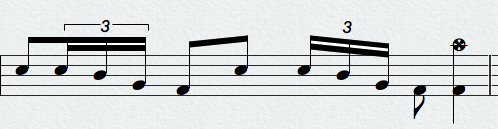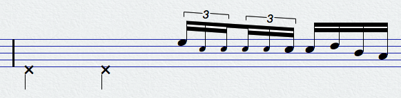 アップテンポの8ビートなどで効果的かもしれません。運指は一例ですが、タム回しとキックを「ラー・ファ・ド」という比較的楽な運指に置き換えてます。これの応用で6(3)連とかでやるとハッタリの効くフレージングが可能です。