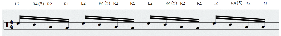 指ドラムで一番やっかいなのが「ロール(Roll)」や「フラム(Flam)」系のフレーズ。「ロール」は連続で叩く奏法(ダララララ~というあれが有名)で様々なバリエーションがあります。フラムというのは、2本のスティックですばやくLR(RL)と叩いて装飾音をつける奏で、2つの音の間隔や強弱には同じくいろいろなバリエーションがあります。