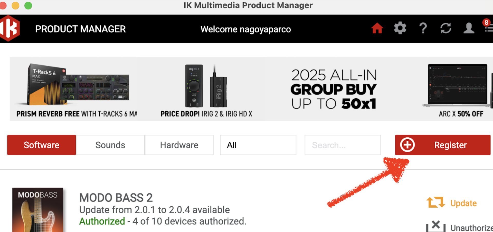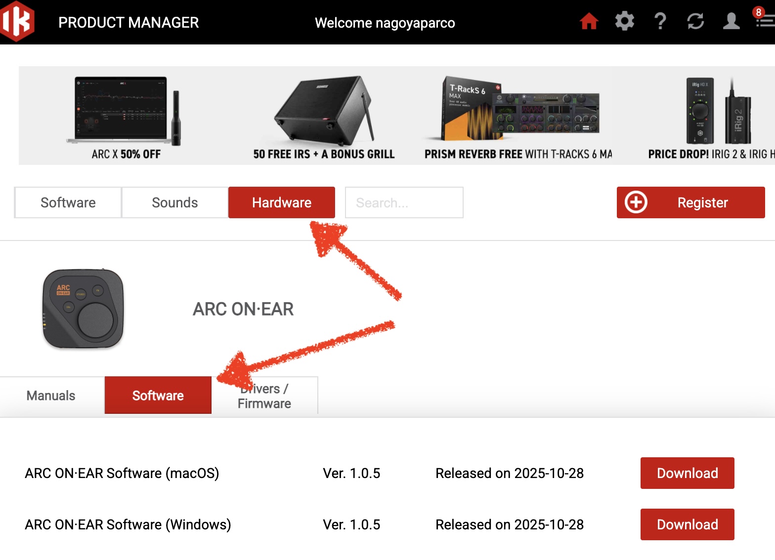 シリアルが正常に入力されるとIK Product Mangager上の「Hardware」 > ARC ON•EARの「Software」から対応ソフトウェアをダウンロード・インストールできるようになります。