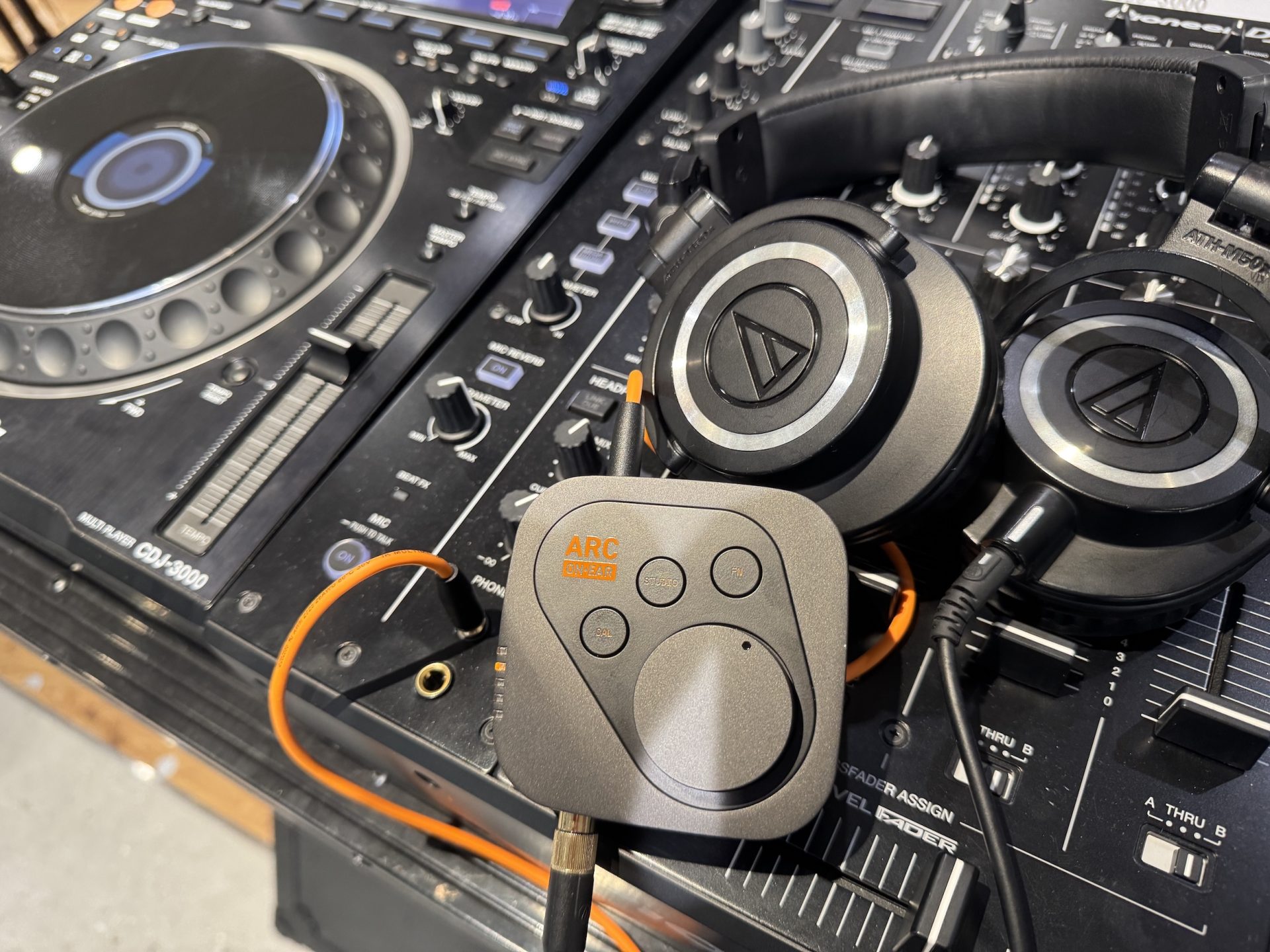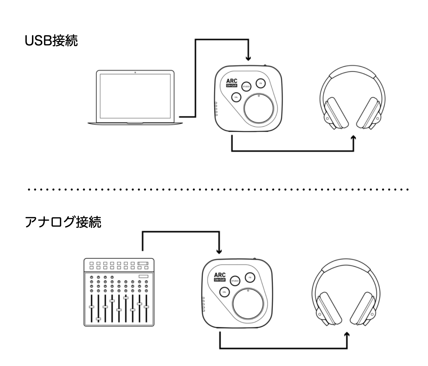 なのでARC ON•EARを補正機能付きUSBオーディオインターフェイスとして使用するのはもちろんのこと、「お気に入りのオーディオインターフェイスはあるから、それを使いつつヘッドホンの音を補正したいんだよなぁ」という場合や、他にもパソコン・DAWでの使用だけでなく上記のようにDJ機材やPAミキサー、シンセサイザーのような電子楽器で正確なモニタリングしたい!という場合にも使用可能。