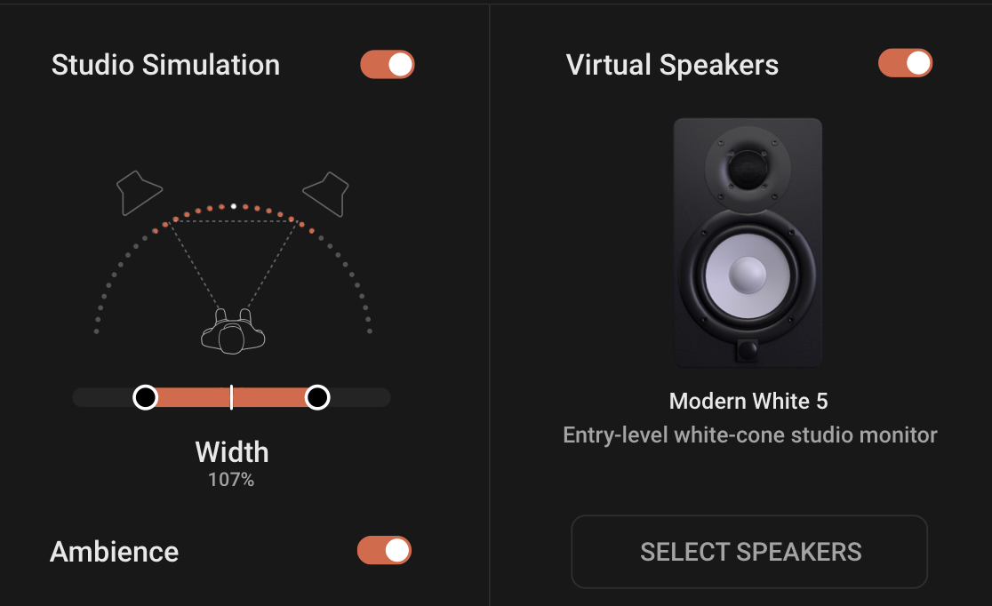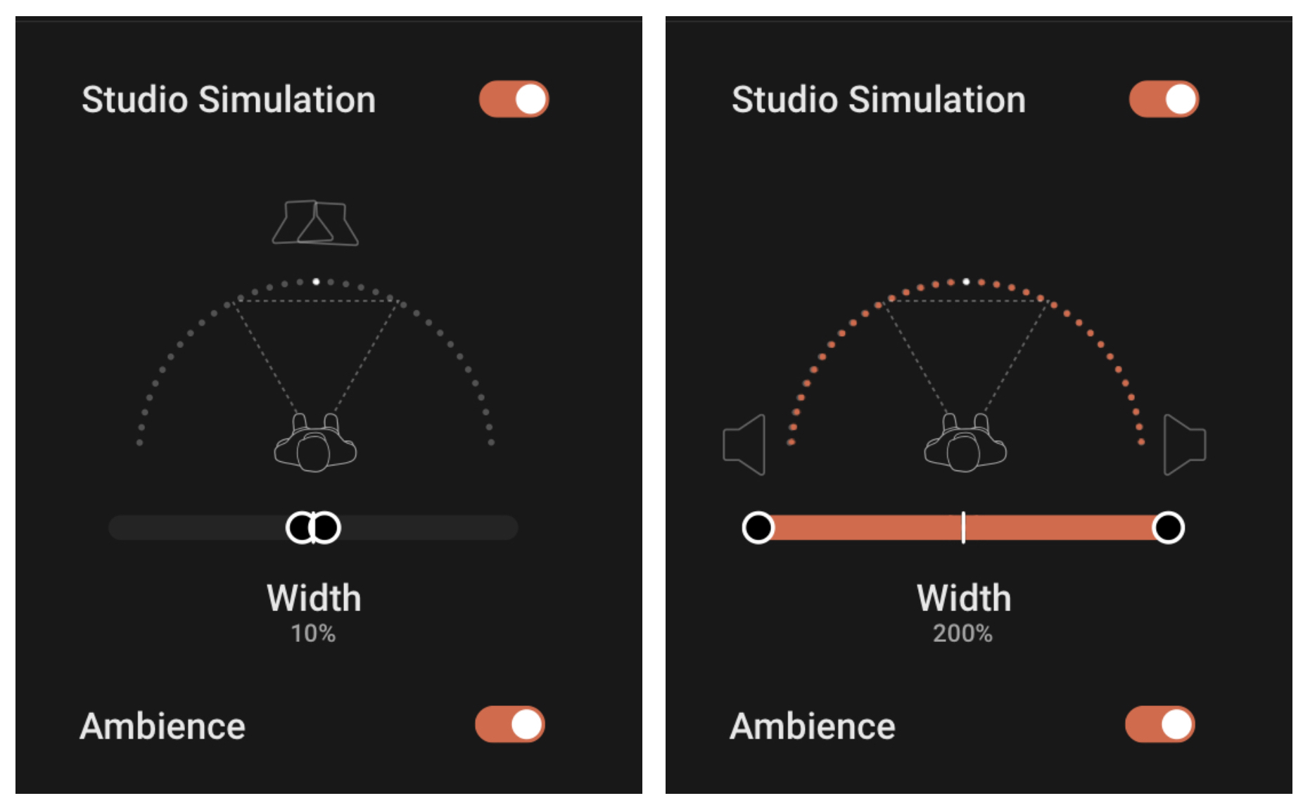 他にも左右のスピーカーの位置を狭くした/広くした場合の聴こえ方を切り替えてみたり、奥行きを加えてステレオ感をより自然に感じさせるAmbienceのON/OFFなどが可能で、よりリアリティあるスピーカーシミュレーションが可能。