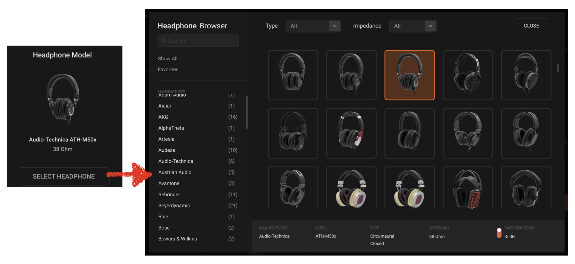 “Headphone Model”からメーカーから提供される様々なヘッドホンの補正プロファイルを選択することが可能です。