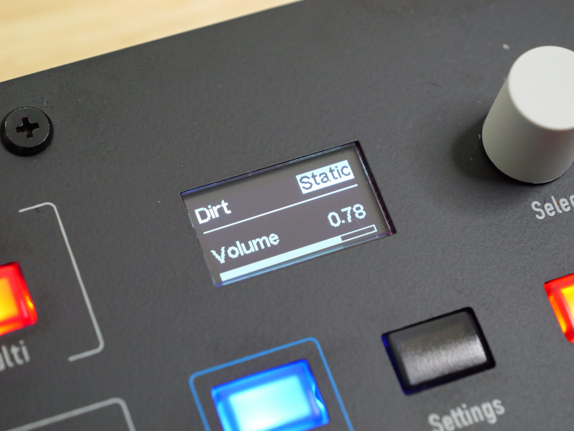 上記の“Dirt(SHIFT+Resonanceつまみ)”でノイズの音量を、Selectエンコーダーでノイズの種類を選択できます。