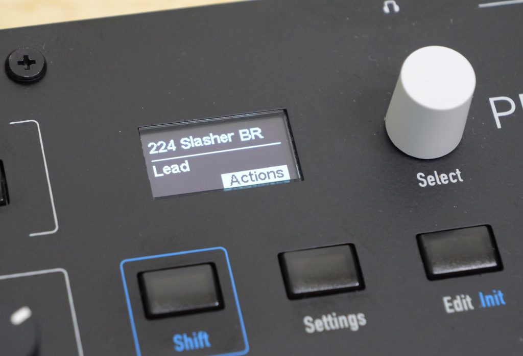 詳しい部分やセクション毎の挙動については後述するとして、取り急ぎ音を聴きたい場合は右上のPresetボタンをプッシュしてSelectダイヤルを回すと予め用意された224のサウンドプリセットにアクセスする事ができます。