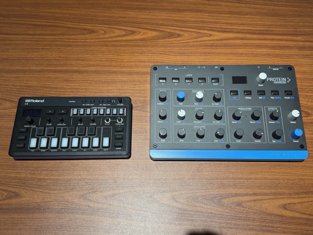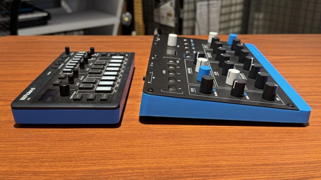 ちなみに、なんとなく色合いが似ていたRolandのAIRA Compact J-6と並べてみると上記のような感じ。