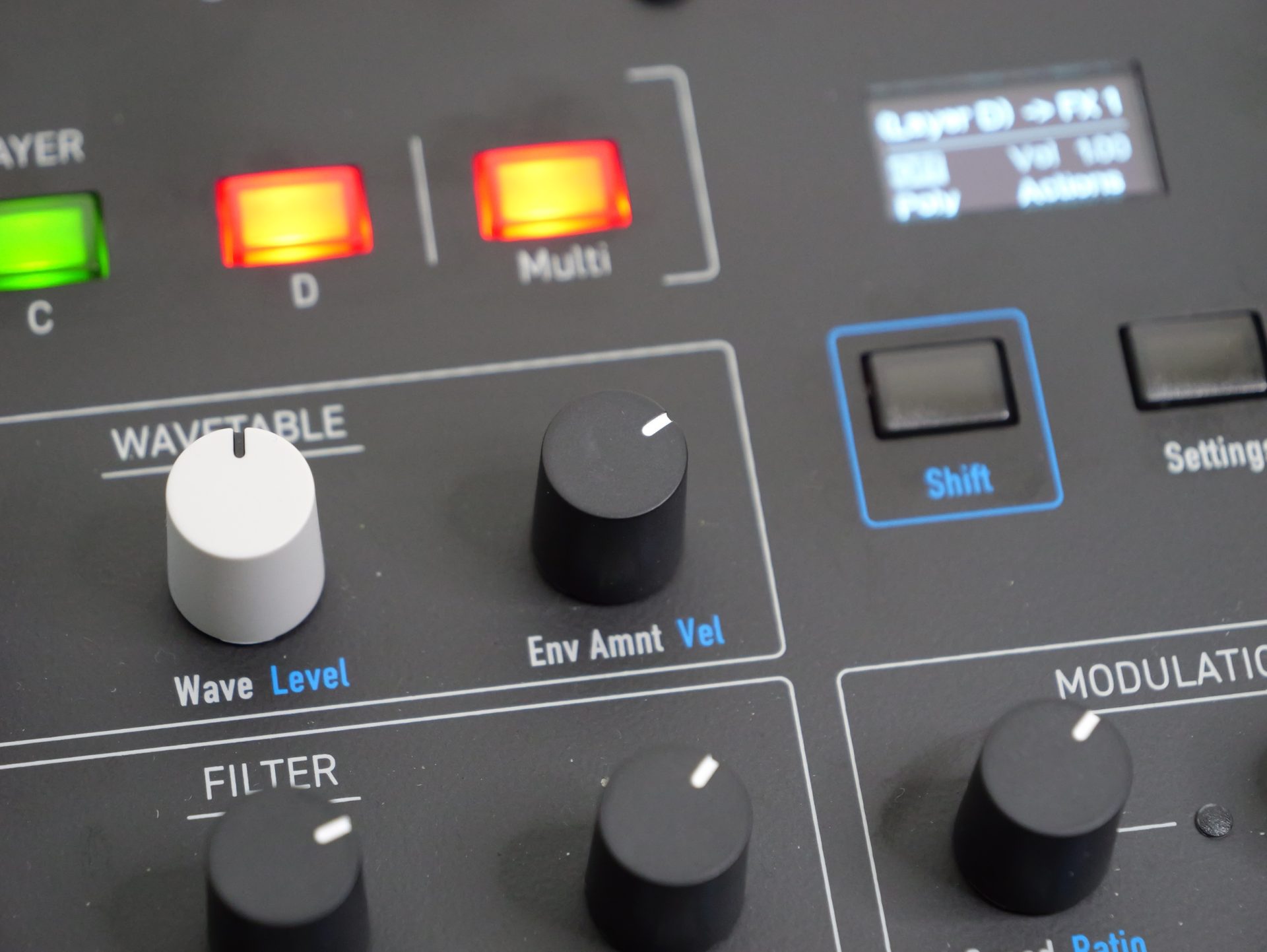 各々のレイヤーには、2つの独立したオシレーターやフィルター、エンベロープ、モジュレーションが用意されており、同時発音数は全レイヤー合計で最大8ボイスまで対応します。