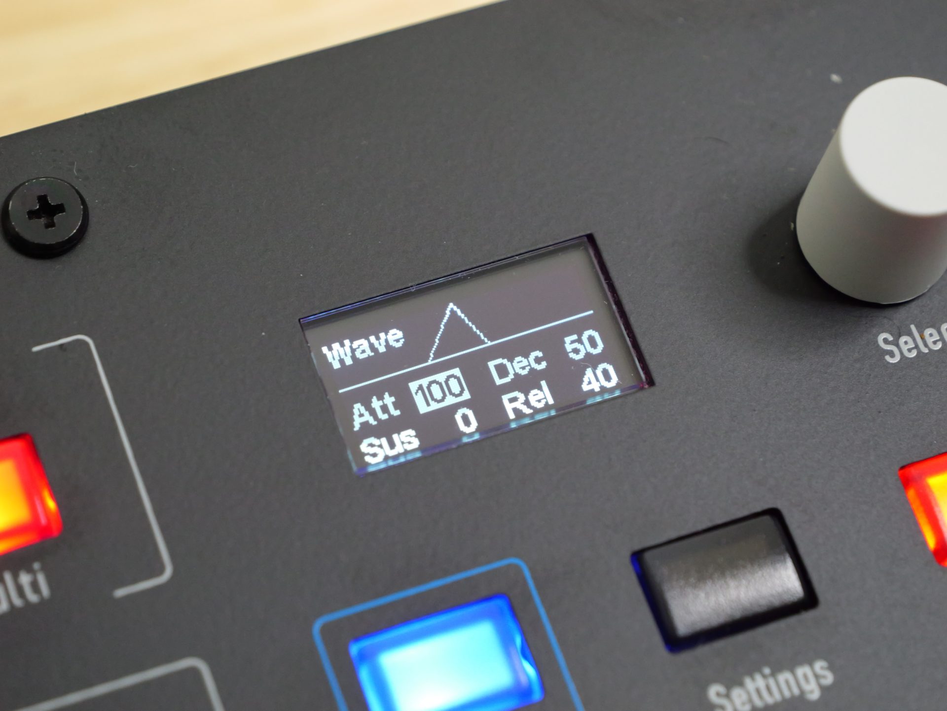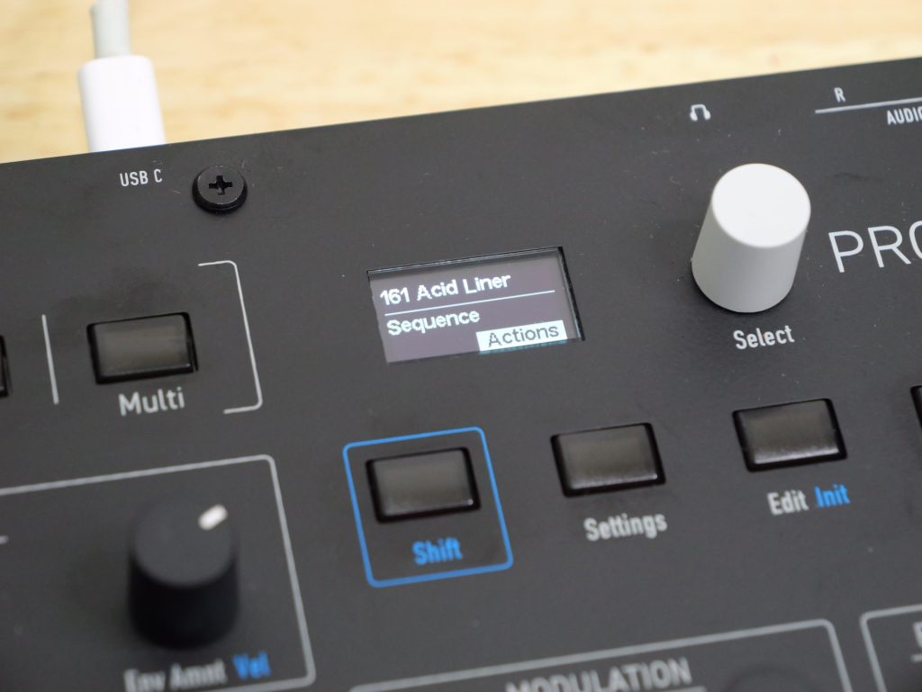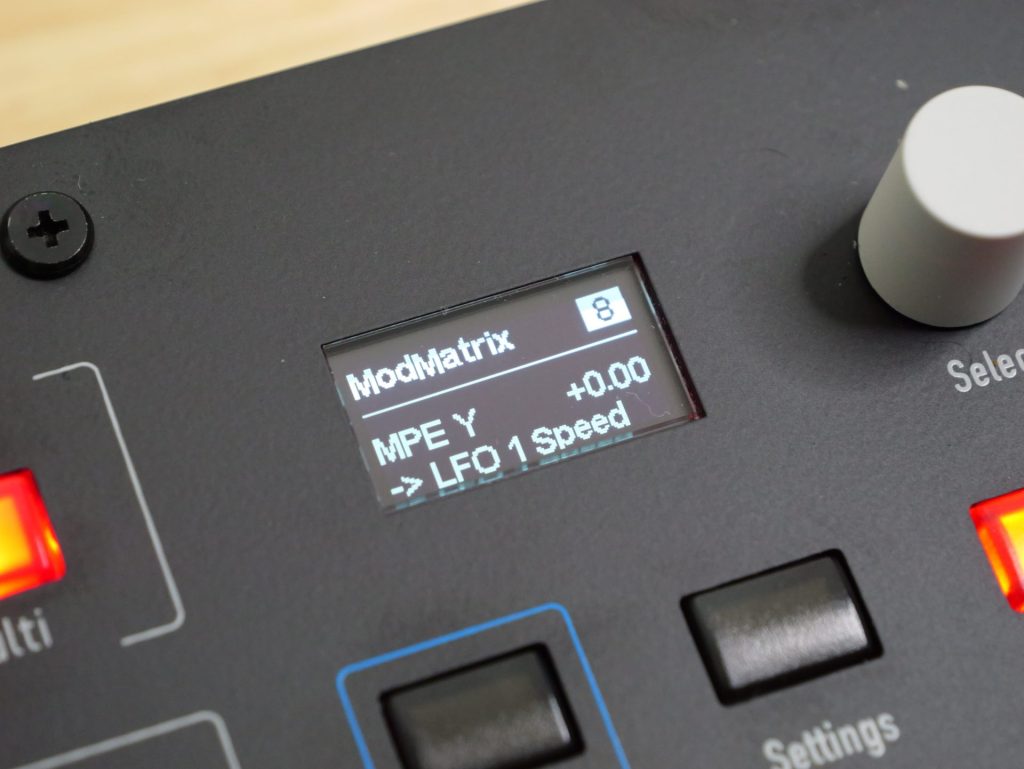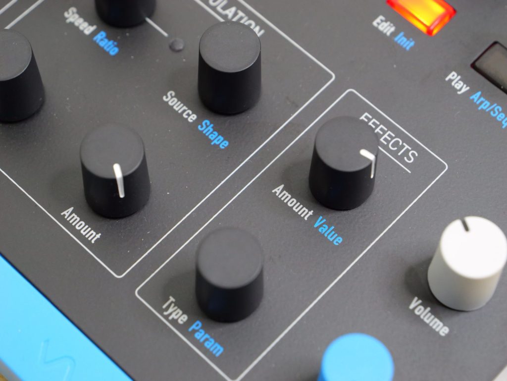 例えばAmp Envelope内のAttackとReleaseを同時につまみでグリグリ動かす、という動作は現時点ではできない模様。Selectつまみで弄りたいパラメーターを切り替えながら操作する必要があります。