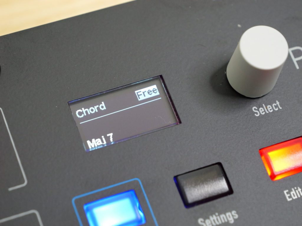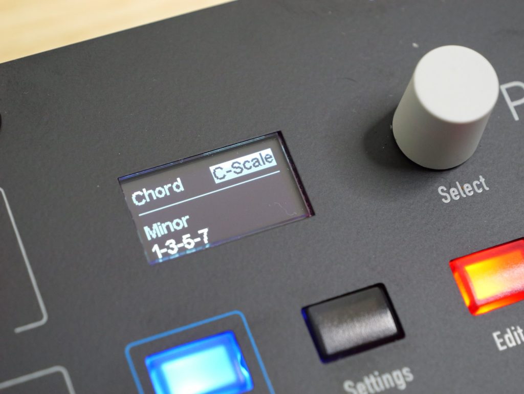 またコード機能およびスケール機能も搭載しており、これらを使用することで、単一のノート入力から、あらかじめ指定したコードやボイシングを鳴らすことができるほか、適当に入力した音階であっても、指定したスケール内に自動補正して演奏することが可能です。