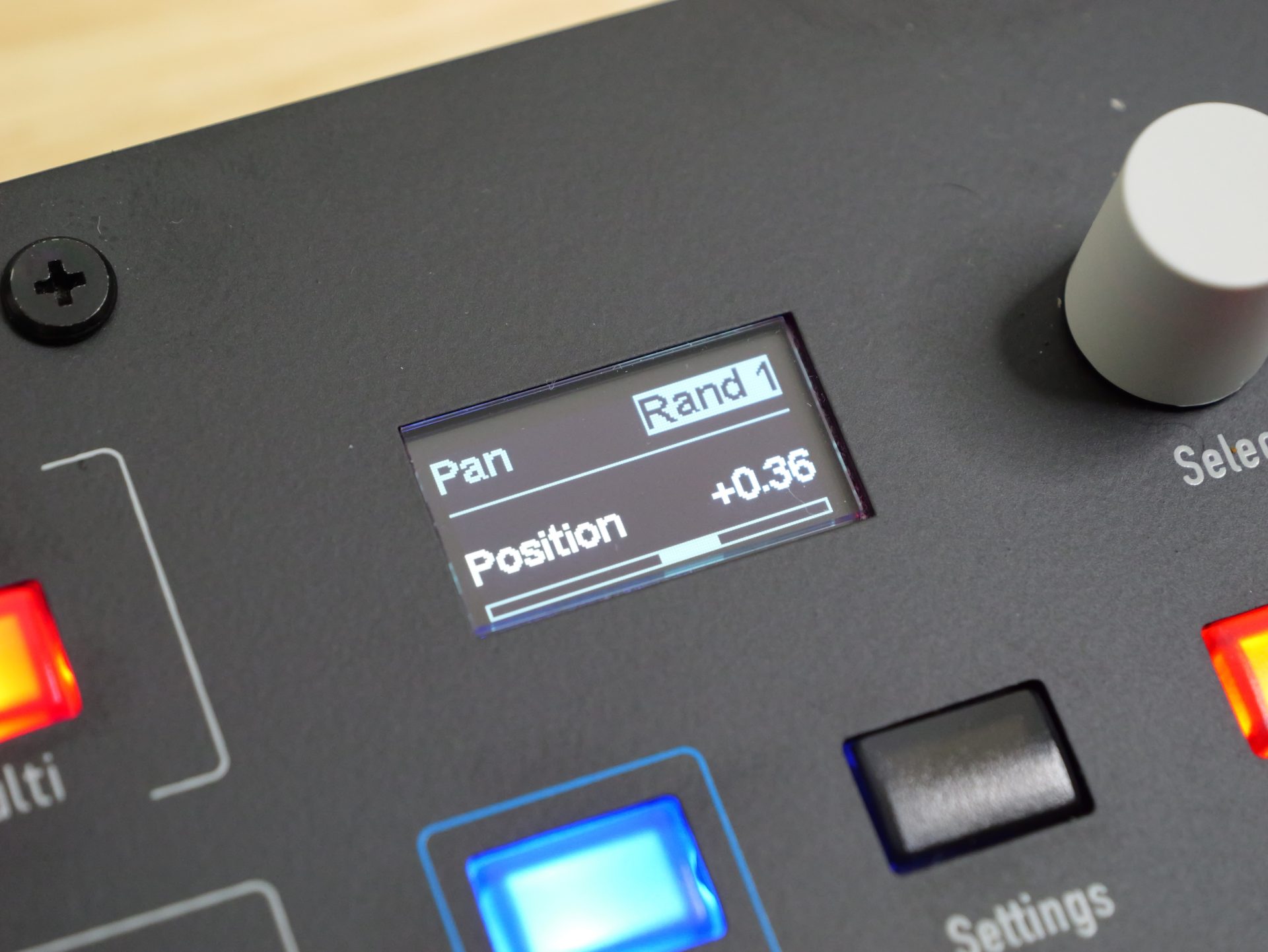 SHIFT+FilterつまみでPANの設定・変更が可能で、FIX(パンの位置固定)に加えランダムでPANが変化するモードが1〜5まであり、数値が上がるほどPANの広がりが増していくようです。