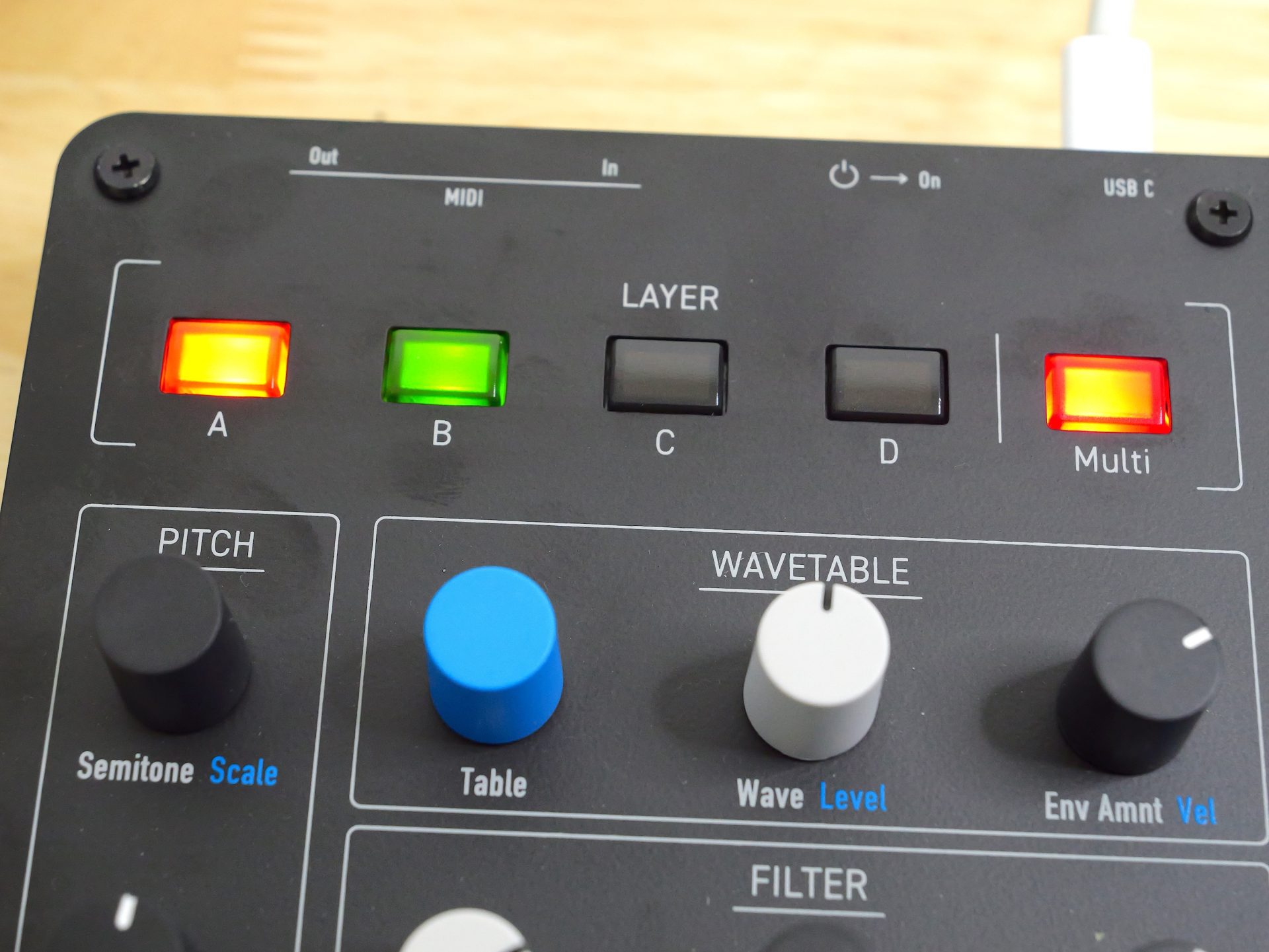 - 電源供給および USB MIDI 接続用 USB Type C
