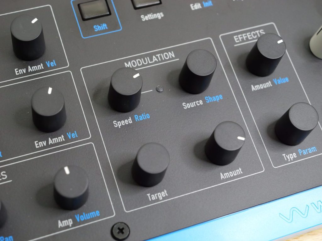 LFOも2系統・波形はSine/Triangle/Pulse/Saw/SawUP/Random/S&Hの7種類用意されており、その他のセクションと同じくつまみで操作可能。操作できるのはSpeedとRatioのみなので、他の高価なウェーブテーブルシンセのようなLFOを作り込むタイプではないようですね。ウェーブテーブルに慣れていない方やライブ中にサクッと音を操作したい場合などであれば、このくらいシンプルな方が逆に良いのかもしれません!