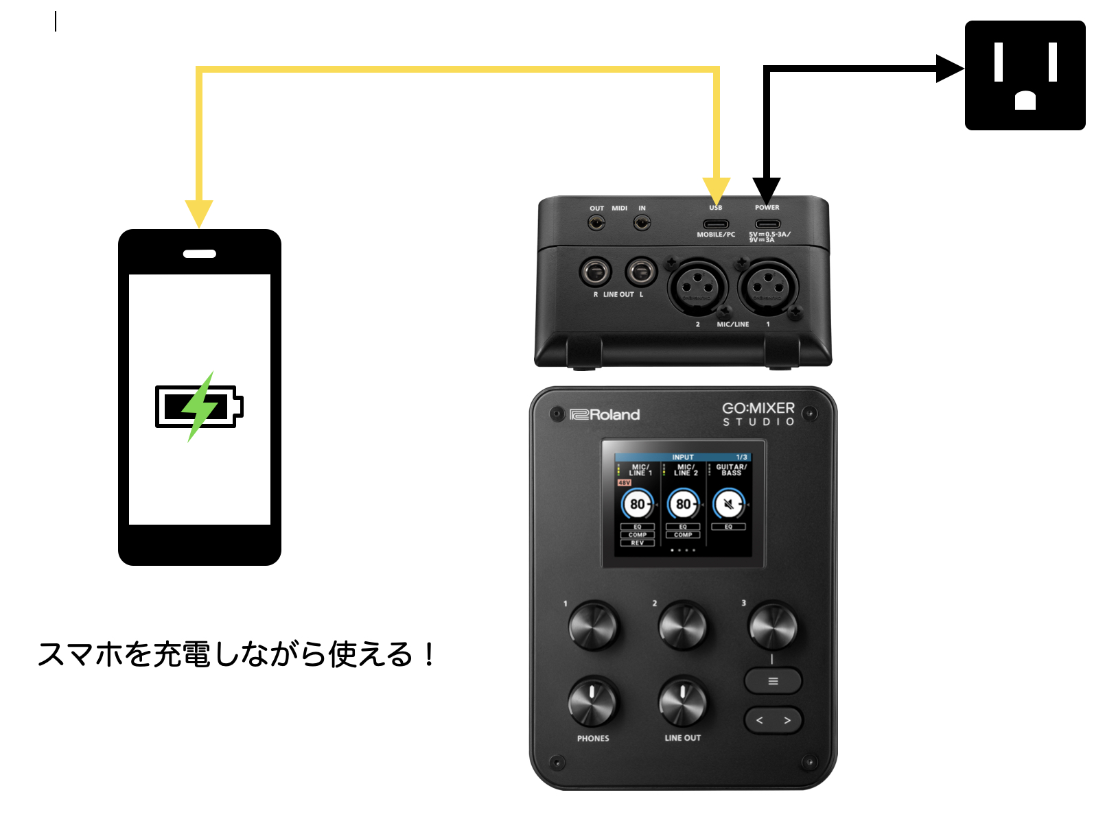 一般的なオーディオインターフェイス同様、こちらのGO:MIXER STUDIOもUSBバスパワー給電に対応しているので基本的にはパソコン・スマホと本体をUSB-C同士で接続すれば、すぐに駆動するのですが、上記図のように電源供給用のUSB-Cをコンセントに繋いた上で通信すれば、スマホやタブレットを充電しながらも使えるという有り難い仕様になっています!