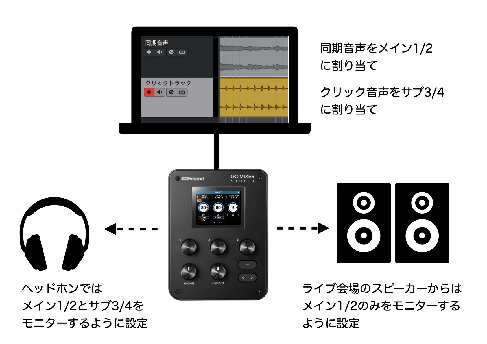 上記のように動機で流したいメインの音声をUSB1/2、クリックパートをUSB3/4に割り当てておくことで本体でメイン音声とクリックを個別に音量操作できるようになりますが、更に本機種にはデュアルバスという、ヘッドホンでモニターする音と、LINE出力から配信・録音する音のミックスバランスを個別に設定可能なので、メイン音声(USB 1/2)はメインモニター・ヘッドホン双方がから聞こえるようしておき、クリックの音はヘッドホン出力のみONにし、メインモニターにからは出ないようにOFFにしておくことで、同期演奏をクリックを聴きながらスムーズに行うことが可能となります!