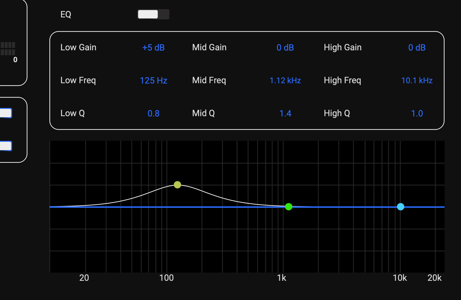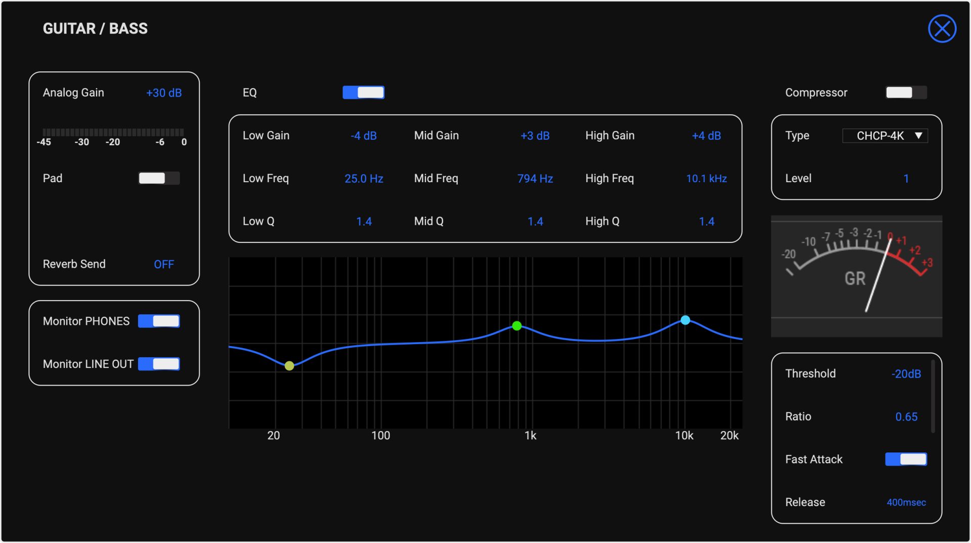 また、EQはLOW/MID/HIGHの3バンド仕様。Q幅(バンド幅)も本体内で調整でき、また後述の専用アプリを使えばよりグラフィカルにEQのかかり具合を確認することが可能です。更に、EQは入力チャンネルだけでなく、ヘッドホン出力端子やLINE 出力端子にも音独立して調整することが可能です。