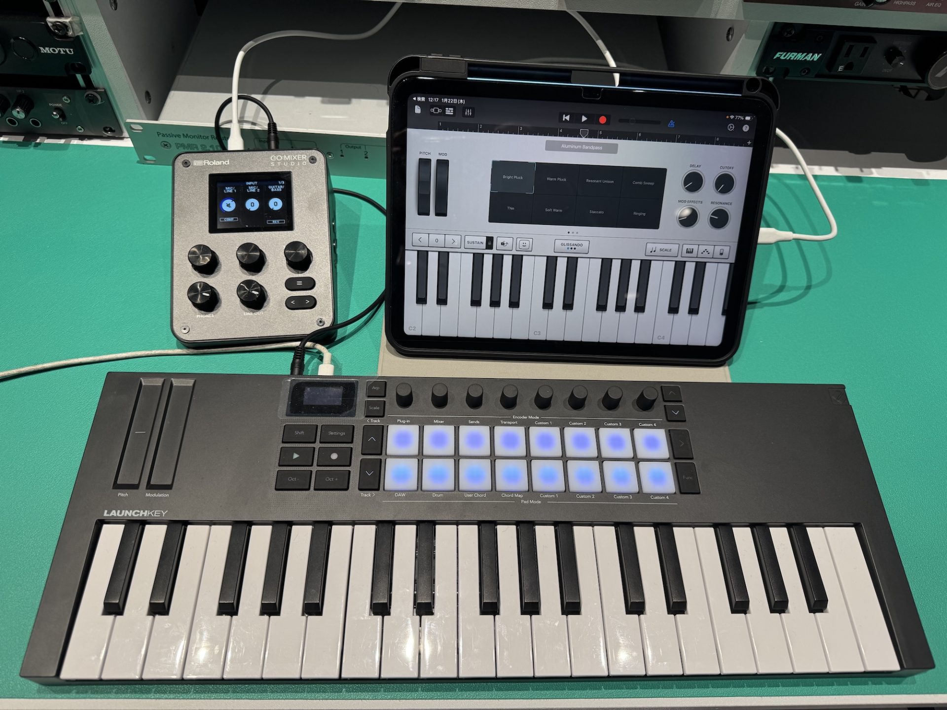 例えば上記のようにMIDIキーボードとGO:MIXER STUDIOをMIDIで接続し、演奏はMIDIキーボードで行い、音声はGO:MIXER STUDIOの高品質な出力を利用する、という方法も可能。