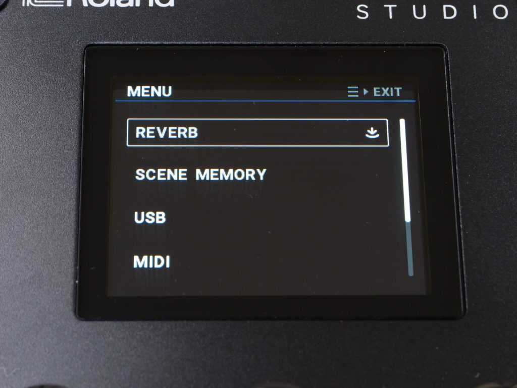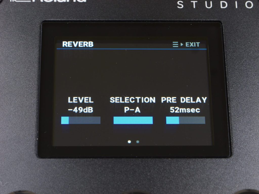 リバーブの種類もルーム、ホール、プレートと異なるタイプを選択可能で、本体画面上から細かく調整可能です。
