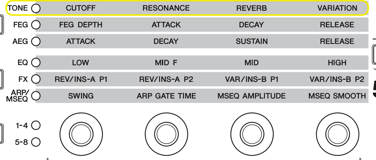 下図の4つのノブですが。4種類の機能が振り分けられていますが、ランプが点灯している段のパラメータ列の「CUTOFF RESONANCE PPAN PORTAMENTO」の役割が選択されている場合は、各ノブがそのパラメーターをコントロールする事ができるというわけです。落ち着いて考えれば難しくはないですね。